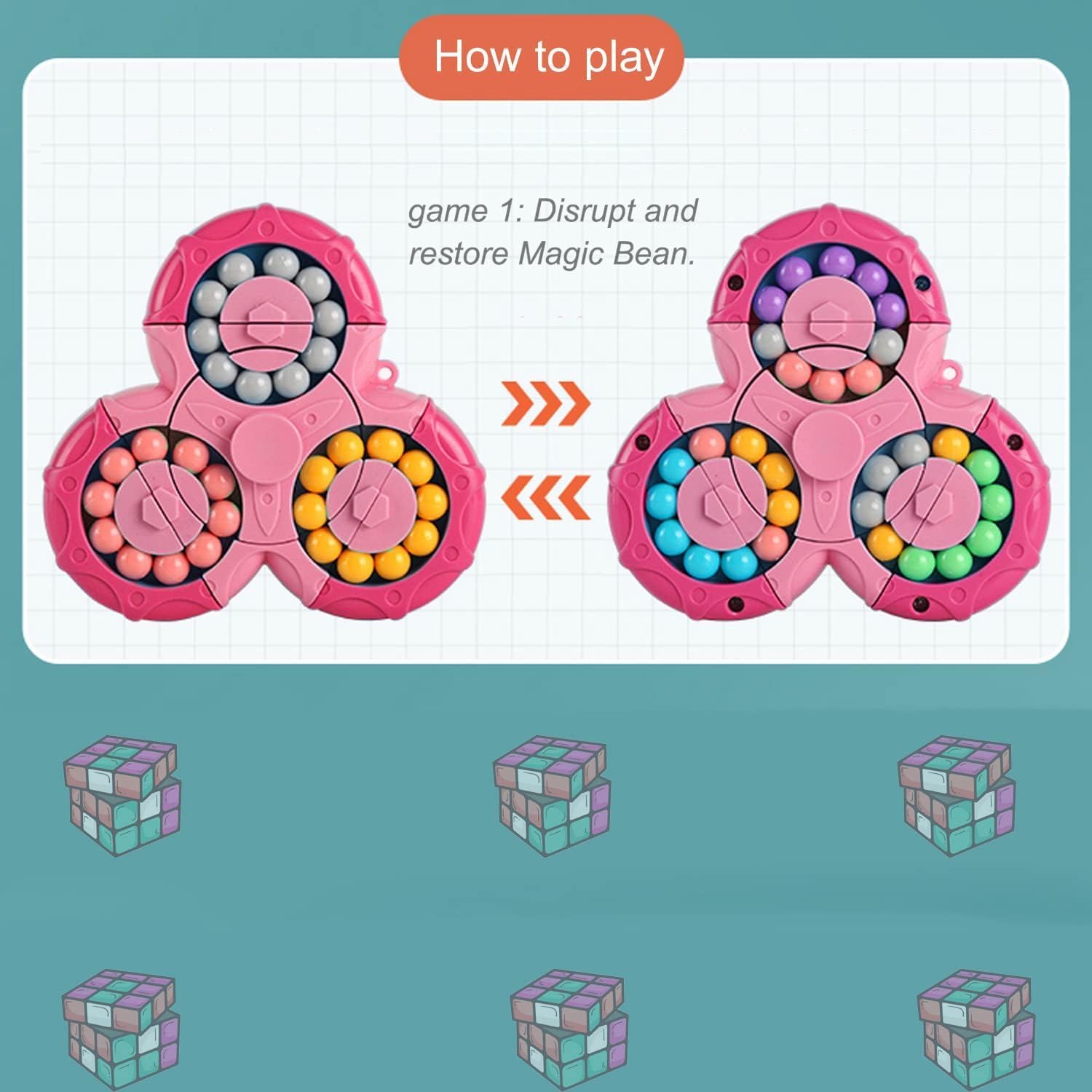 - 【Rotating finger cube toy】 The Magic bean rotating cube toy is double-sided and consists of 6 different colors and 60 magic beans. It is divided into 3 circles, the top of which can be rotated, and each bead is firmly embedded in it, and it is not easy to fall out. Spinning the middle circle can connect 3 circles of beads. You can move the beads freely with both hands and change the beads to different colors. Then make them back to all the same colors as before.
