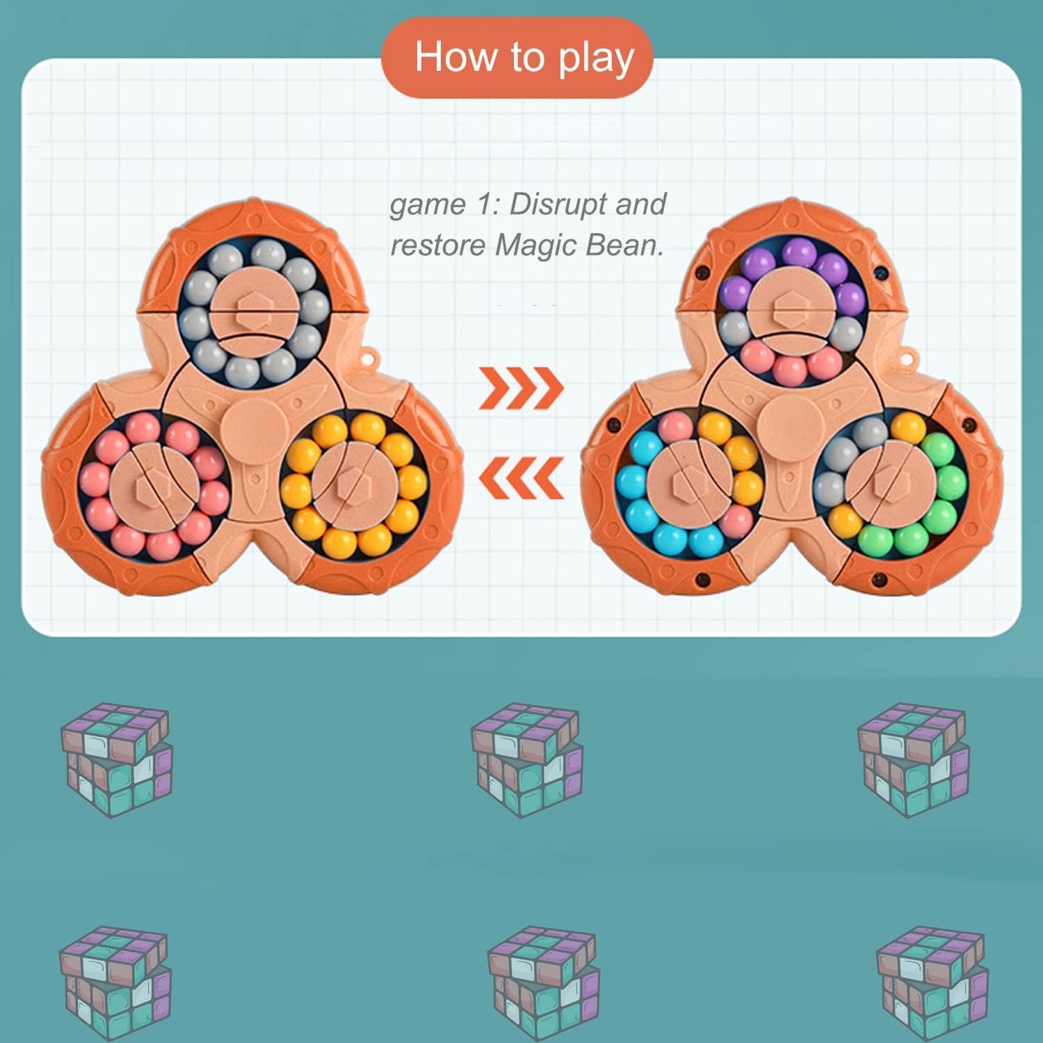 - 【Rotating finger cube toy】 The Magic bean rotating cube toy is double-sided and consists of 6 different colors and 60 magic beans. It is divided into 3 circles, the top and inner of which can be rotated, and each bead is firmly embedded in it, and it is not easy to fall out. Spinning the middle circle can connect 3 circles of beads. You can move the beads freely with both hands and change the beads to different colors. Then make them back to all the same colors as before.