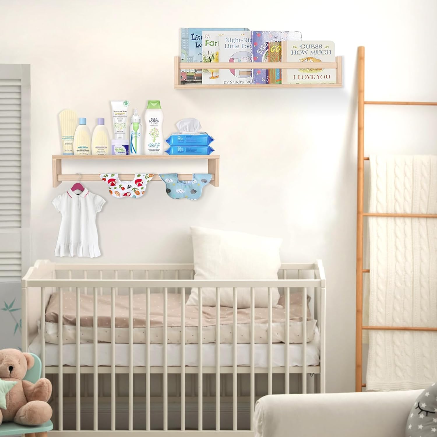 - ♻️SOLID STORAGE – The nursery bookshelf made of high quality pine wood , this hard floating shelving is sturdy and dependable. These shelves can hold a whole row of books, toys and stuffed animals with no issue! The floating bookshelf are designed with style and functionality in mind. Great for bedrooms, kitchens, and bathrooms!
