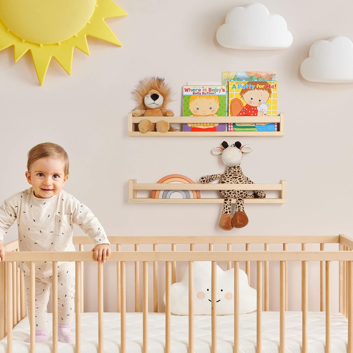 - [Versatile Nursery Shelves] -Fun Memories floating shelves offer two installation options, making them adaptable to any space or aesthetic. They're perfect as a nursery bookshelf, living room display shelf, or kitchen spice rack