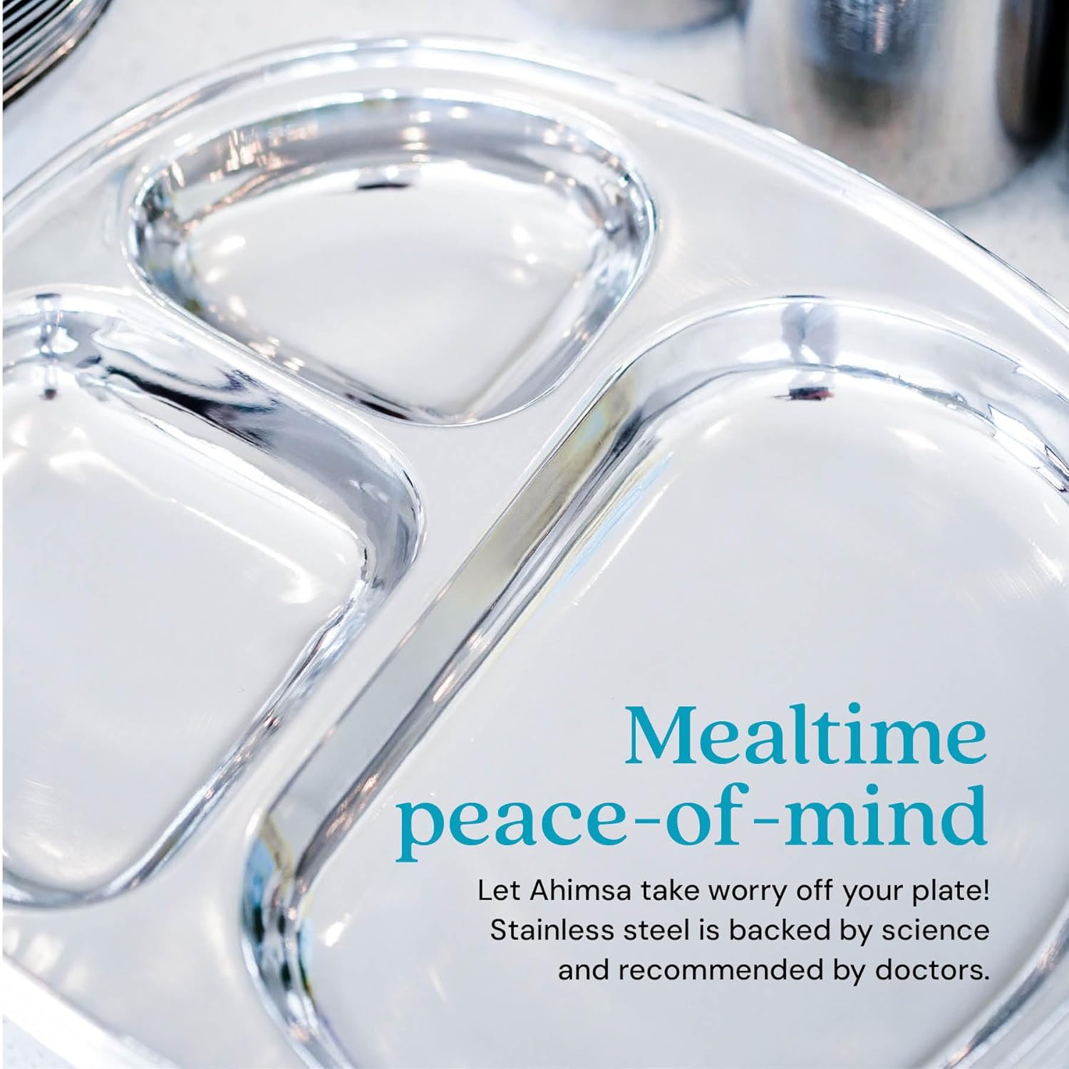 - Kid Approved — Ahimsa Mindful Mealtime Sets make mealtime fun with vibrant and colorful stainless steel kids plates that children adore. Included is a stainless steel toddler plate with dividers, a 8 oz. kids stainless steel cup and small baby bowl, and kids silverware (1 kid fork, 1 kid spoon).