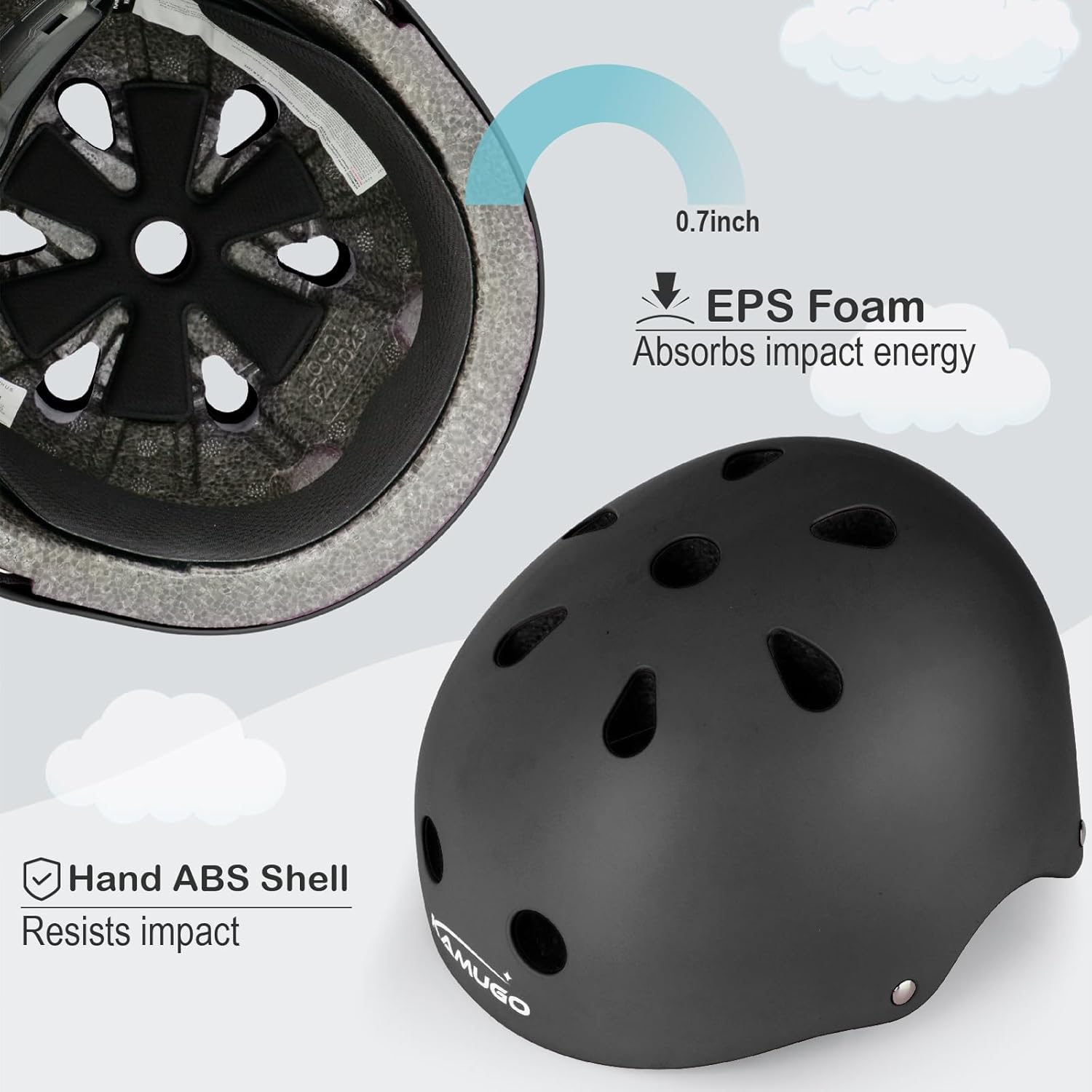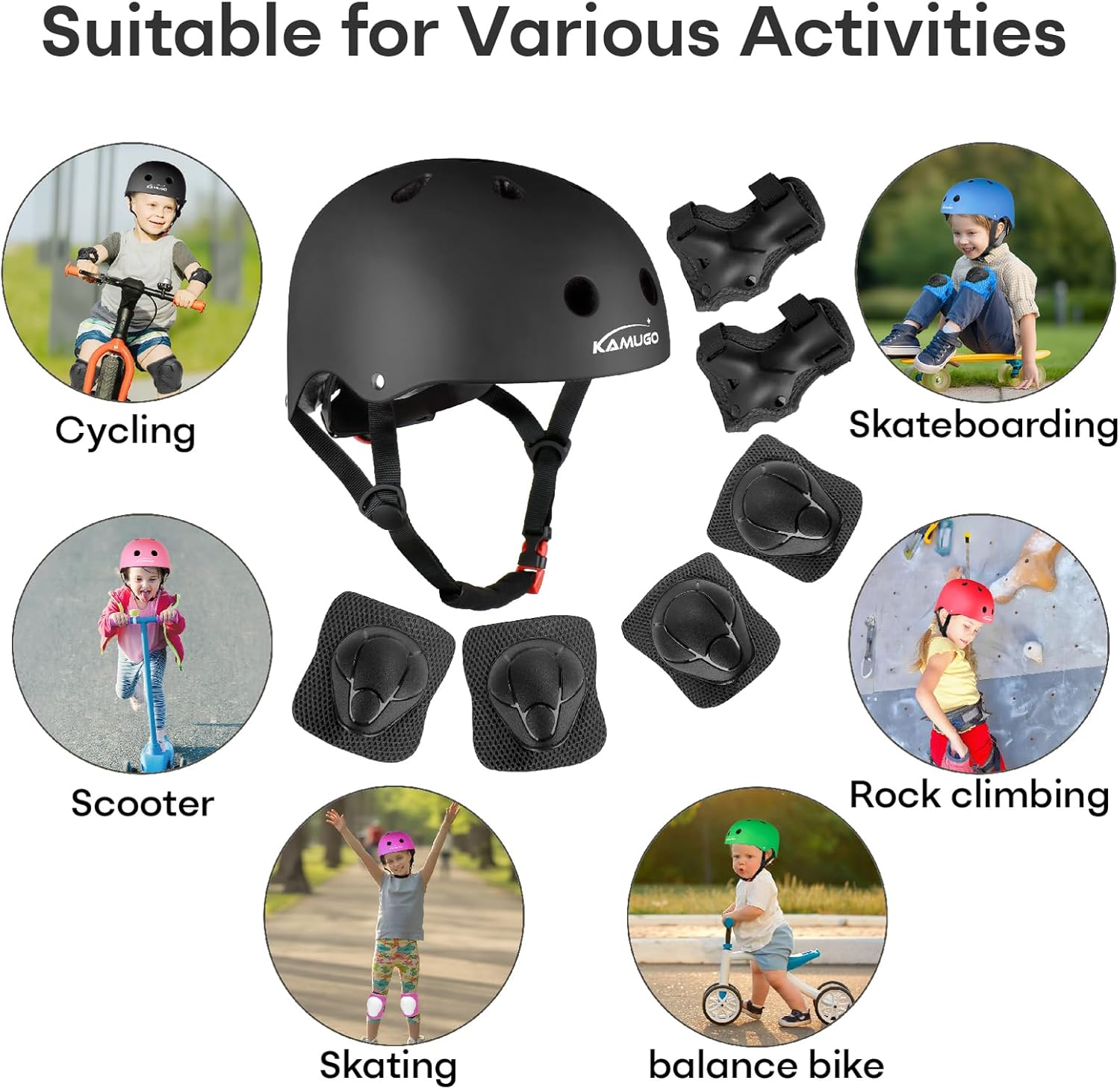 - PREMIUM PROTECTION FOR YOUR KIDS: Suitable for children and toddlers with helmet size: 48-54 cm / 18.9- 21.3 inch.Contain 1 adjustable KAMUGO helmet, 2 knee pads, 2 elbow pads, 2 wrist guards, bring your kids all-round safety protection.