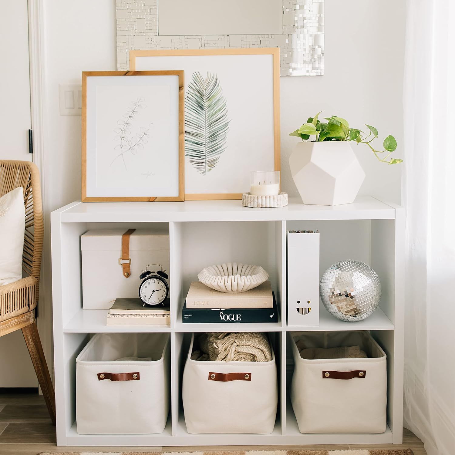 - Decorative Fabric and Vegan Leather – These versatile storage baskets for organizing your everyday life are made with a thick, high-quality fabric and fitted with leather handles to add a stylish touch to a living room, bedroom, office, or personal space.