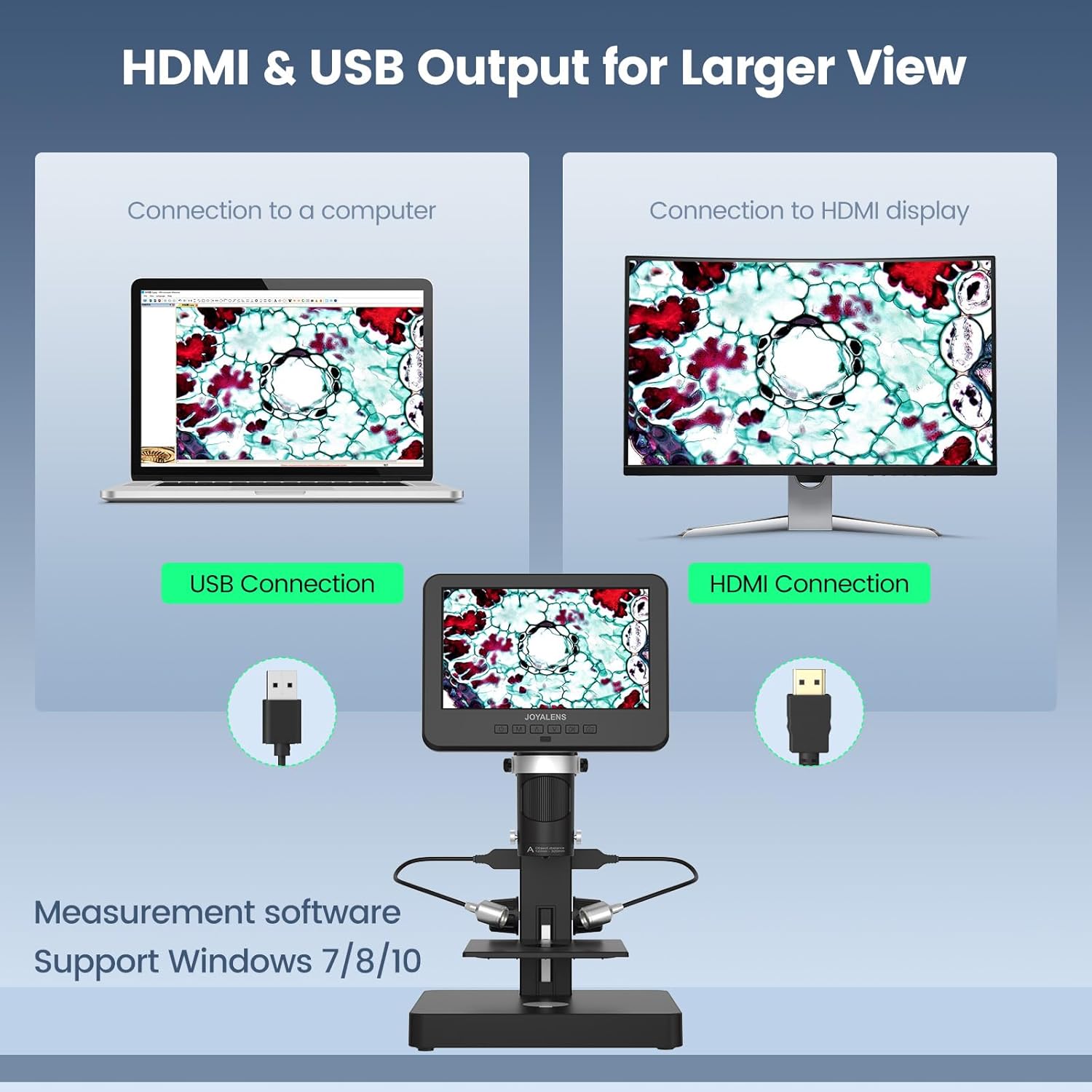 - 【Support HDMI and USB Output】This USB microscope is compatible with Windows XP/7/8/10. Download the measurement software and connect the microscope to your Windows PC. Then you can measure the length of the object and calculate the area, etc. HDMI to a monitor to expand your vision and easily share your discoveries with your friends