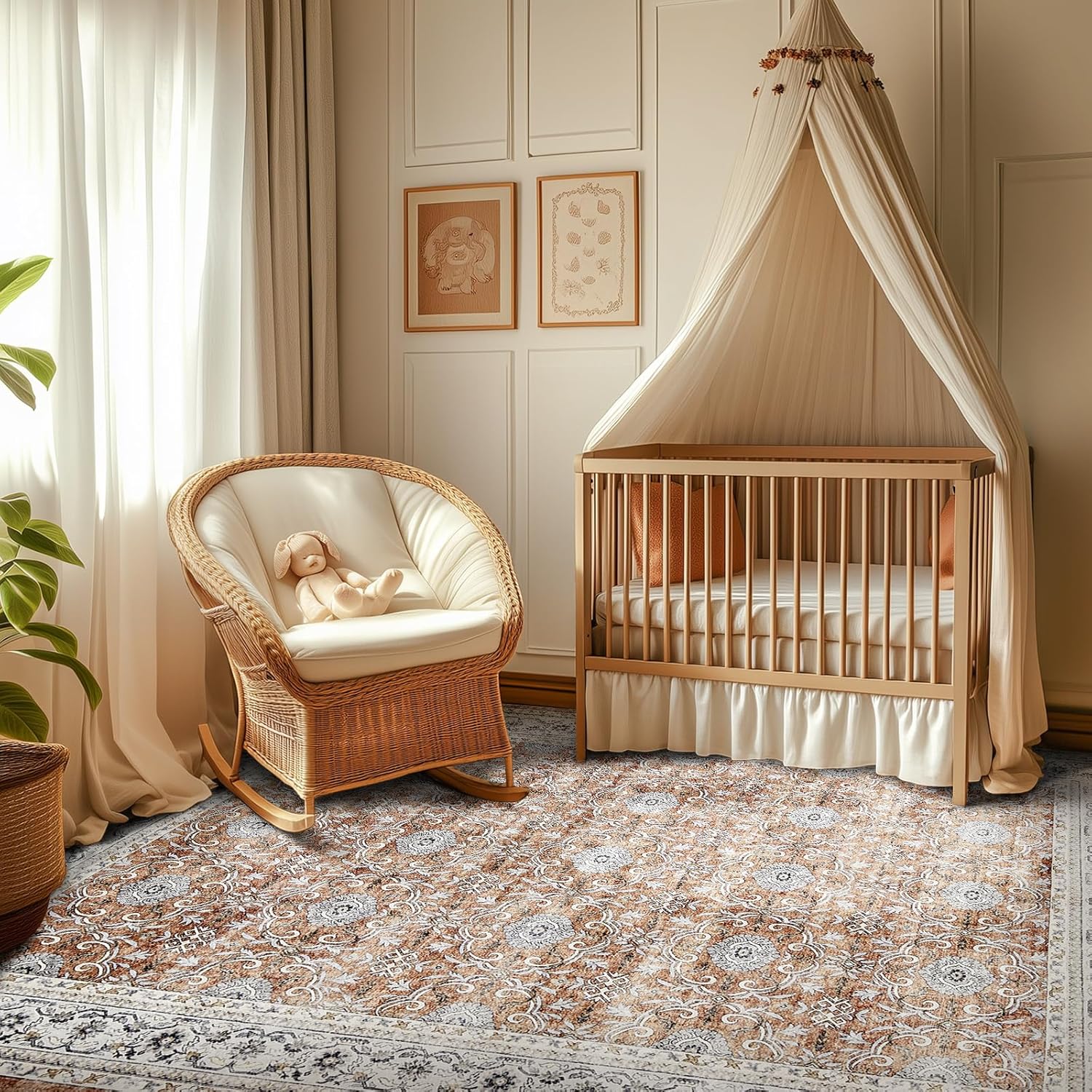 jinchan Floral 5x7 Area Rugs for Bedroom - Machine Washable Vintage Distressed Boho Design Throw Rug Stain Resistant Carpet Low-Pile Thin Non-Slip for Nursery Living Room Dining Room (5‘x7',Orange)