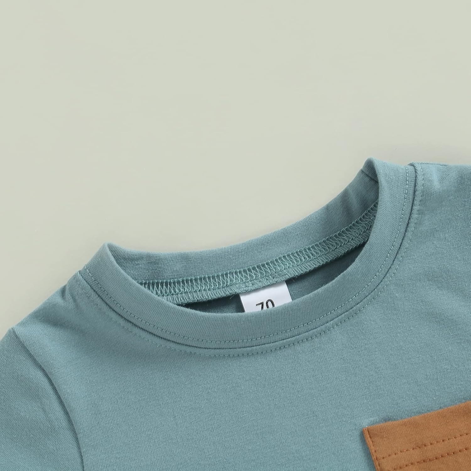 • Relax Crew Neck, One Pocket Front, Striped Pattern, Comfy Short Sleeve T Shirts Tee Tops, Elastic Waist with Drawstring Shorts, Side Pockets, Comfy and Cute Newborn Baby Boys Toddler Kids Summer Outfits Clothes