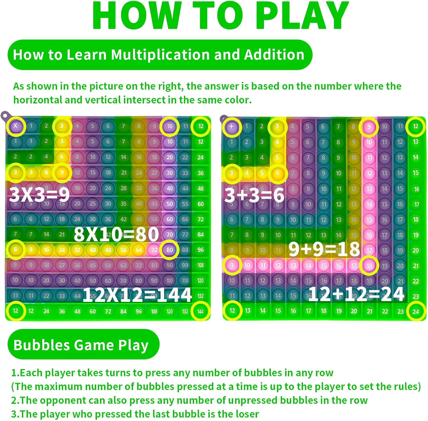 - 【Fun Multiplication Games and Addition Learning Tool】 12X12 multiplication table and 1-12 addition table combined by double-sided printing on the P00P bubble toys, so that children think about the connection between mathematics, such as 6 + 6 = 12, 2X6 = 12; 7X8 = 56, 56 ÷ 7 = 8; 8 + 10 = 18, 18 - 10 = 8, etc., so that children understand the logic of multiplication division addition subtraction between operations, so that children learn and have fun at the same time.