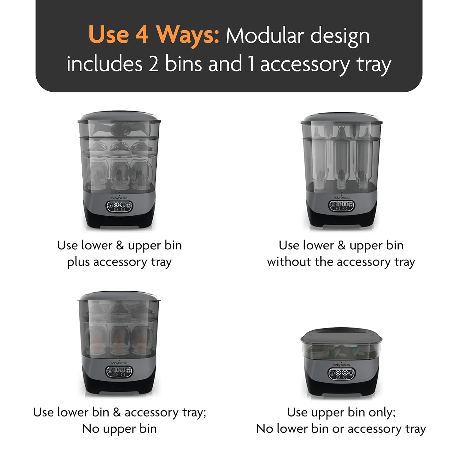 - MOST MODULAR 3-LAYER DESIGN: Use 4 different ways to meet your needs – Only Sterilizer Dryer with large lower bin, shorter upper bin and unique accessory tray