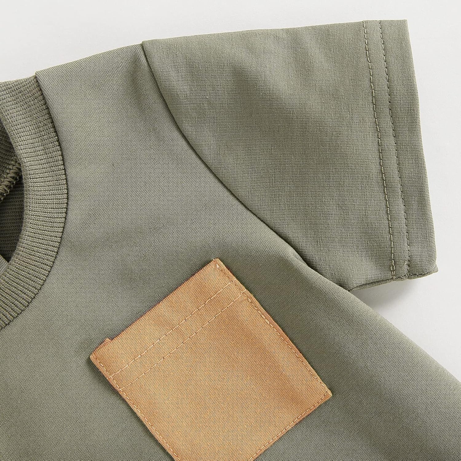 • Relax Crew Neck, One Pocket Front, Striped Pattern, Comfy Short Sleeve T Shirts Tee Tops, Elastic Waist with Drawstring Shorts, Side Pockets, Comfy and Cute Newborn Baby Boys Summer Outfits Clothes