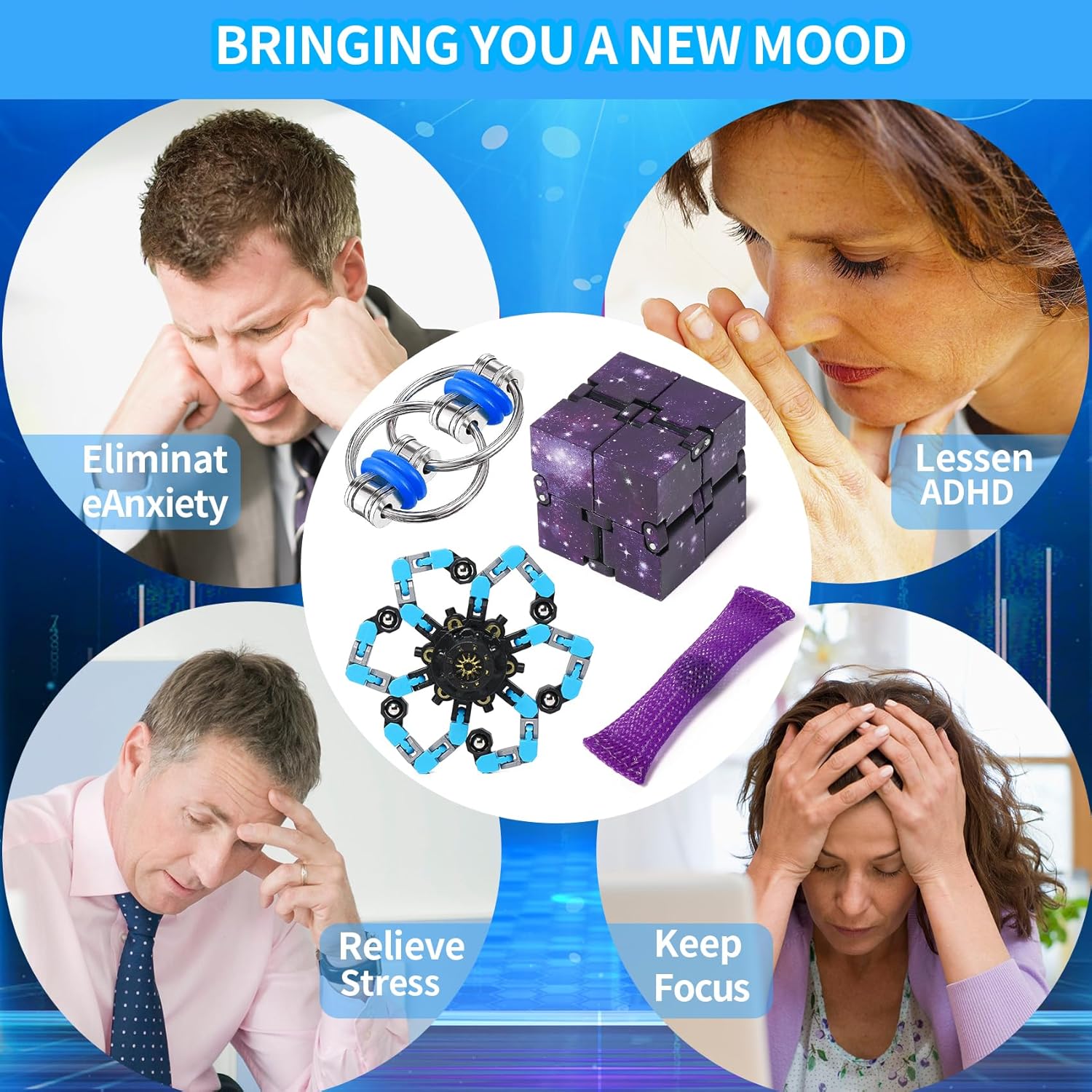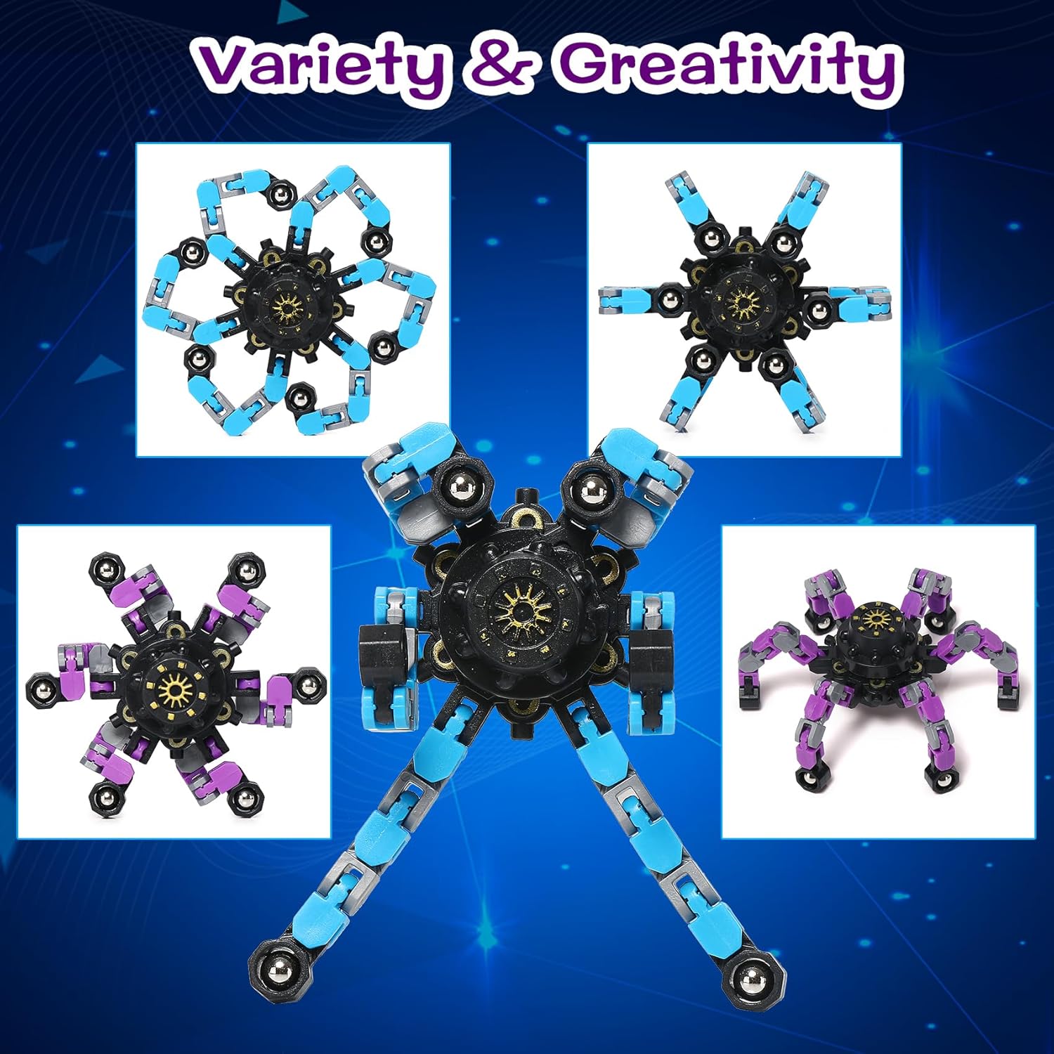 - 🎁8 Pcs Fidget Packs:2 Flippy Roller Chains,2 mesh and marble fidget toys,2 Cubes,2Robot Fidget Spinners.4 kinds of various fidget toys help you relieve stress.