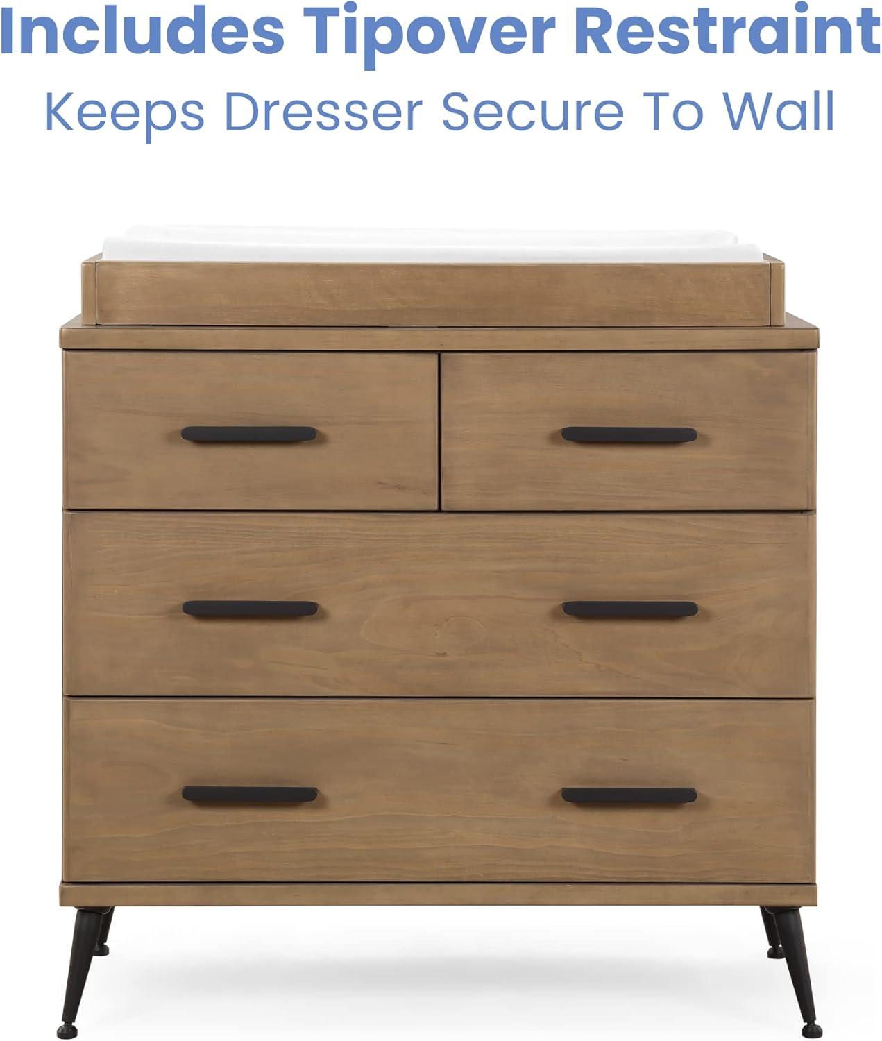 - Dresser Features: Crafted of sturdy, sustainable materials like New Zealand pine to give it plenty of longevity. For your child’s safety, this dresser is outfitted with an interlocking drawer system that limits the number of drawers that can be opened at one time. For additional security, we strongly recommend that all dressers in your home be anchored; dresser includes a wall anchor.