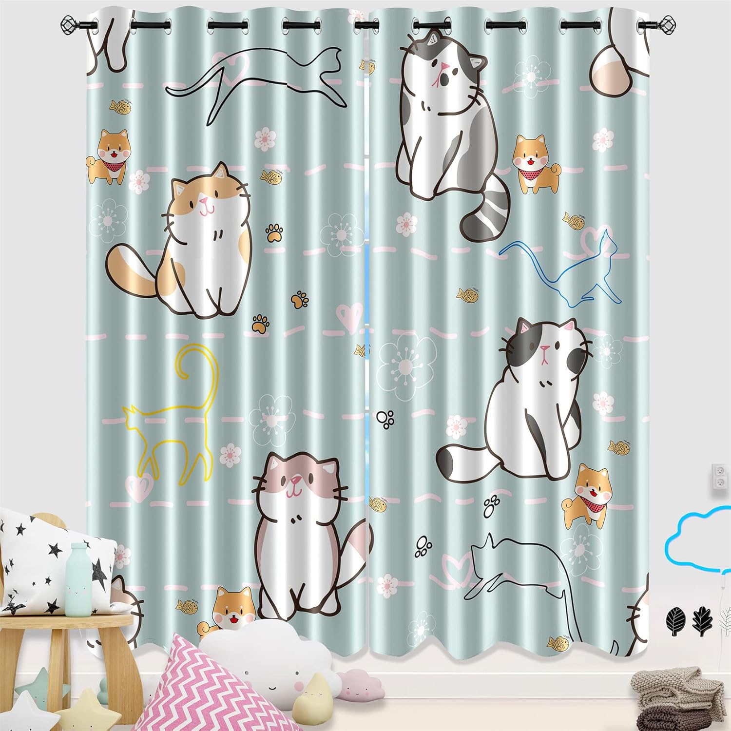 Cartoon Cat Blackout Curtains for Girls Room - Grommets Top, Animal Themed, Thermal Insulated Panels for Bedroom, Nursery Decor, 82 in x 84 in