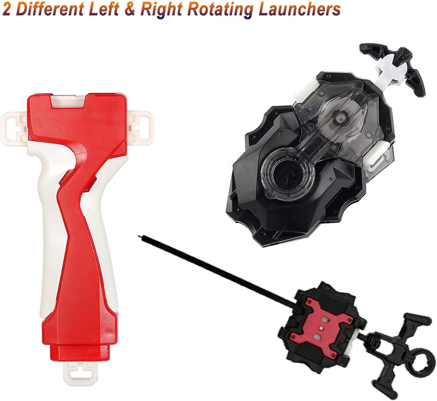 - 【Package Including】- This stadium battling top set comes with 4 x Spinning Tops(B-180 B-181 B185 B187),4 x Sets of Stickers,2 x Launchers,1 x Grip,1 x Arena Combat Game. (Make it look even cooler with the complimentary stickers!)