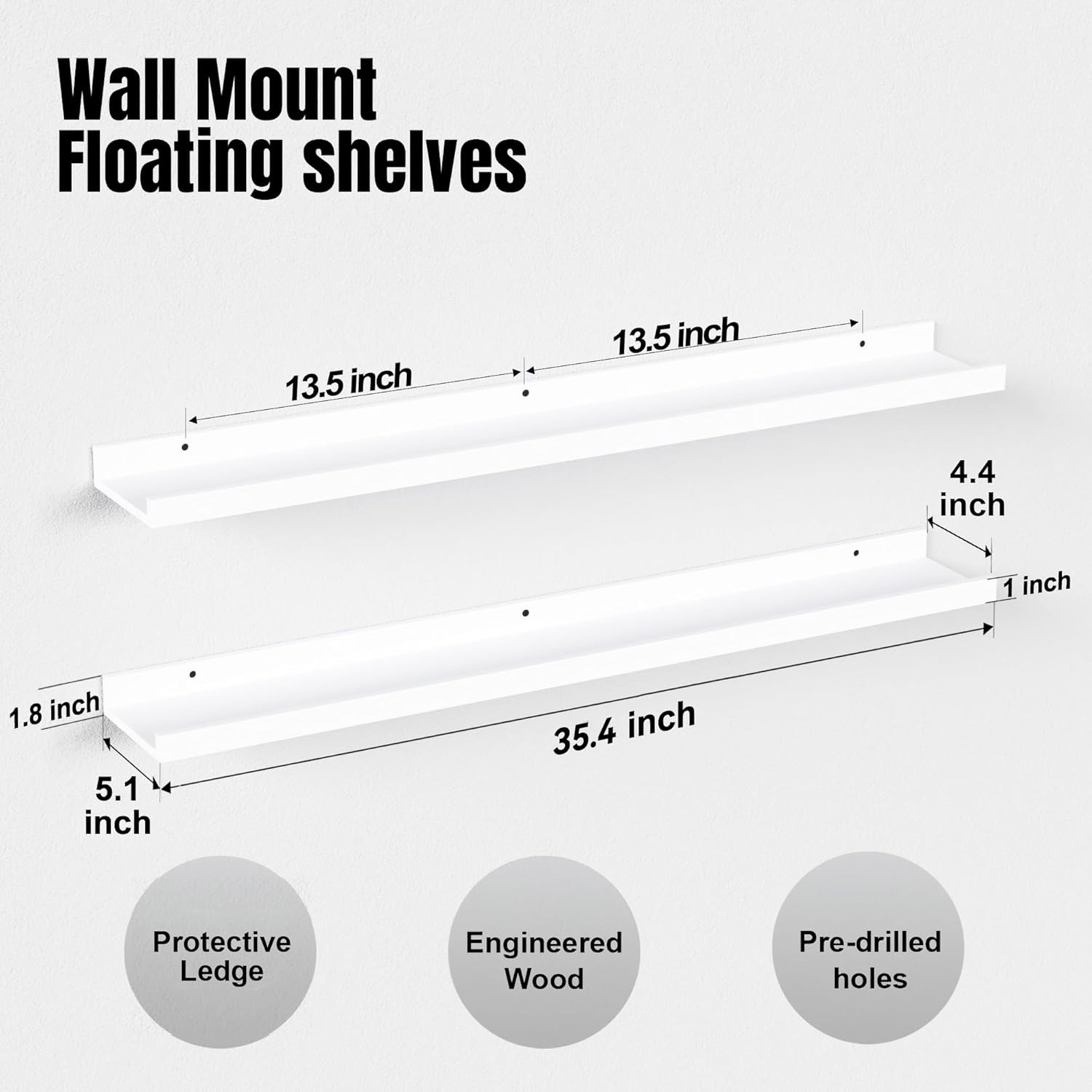 - Sturdy Wall Storage - Crafted from high-quality engineered wood, these shelves are designed to hold up to 20 lbs of art pieces. With dimensions of 5.3"D x 35.4 "W x 1.8"H, these shelves provide practical solutions for wall organization while complementing any decor style, from modern to traditional, rustic to contemporary.