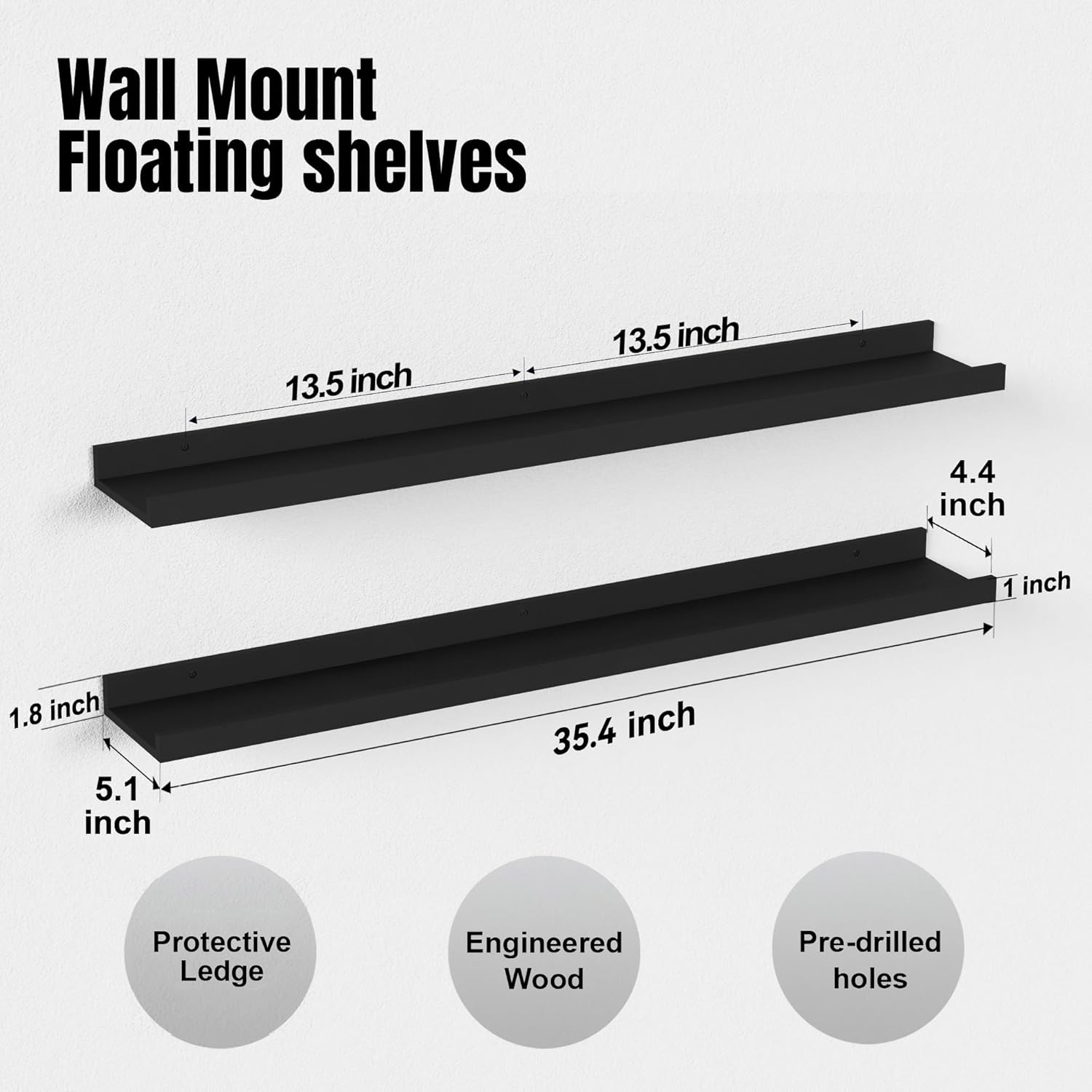 35.4 Inches Long Floating Shelves Wall Mounted, 2 Set Modern Black Wall Shelf for Bedroom, Nursery Book Shelf with Lip, Picture Ledge Shelf for Wall Decor Living Room Bathroom Kitchen- Black