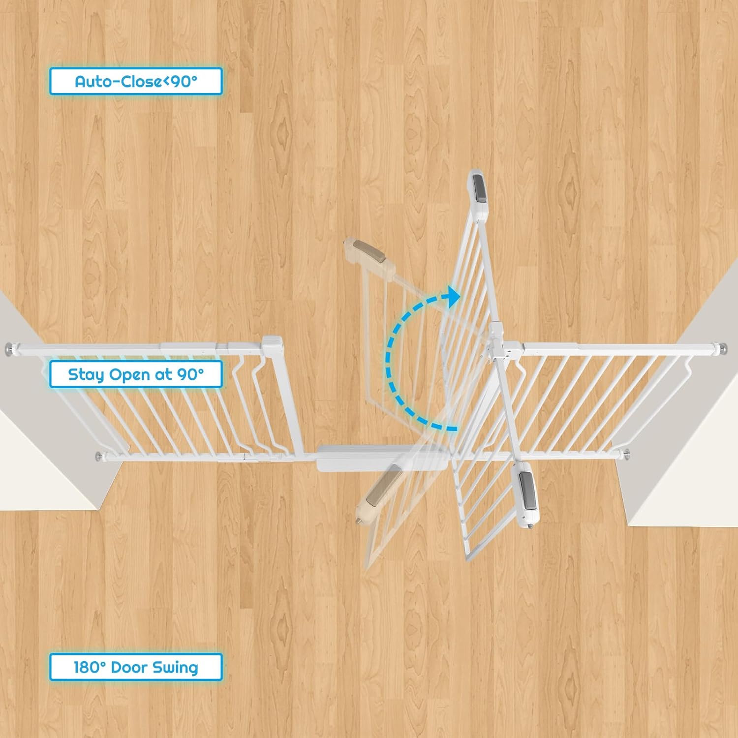 - Safe Double Lock & One Hand Operation: The safety gate latch with an ergonomic handle can be released with one hand, convenient when holding a baby in the other hand. Just press the latch down, pull back and lift slightly. Easy for adults, but difficult for toddlers, children or kids. Two-way swinging door. If opening angle is less than 90°, baby gate will be closed automatically; but if opening angle is more than 90°, baby gate will keep opening.