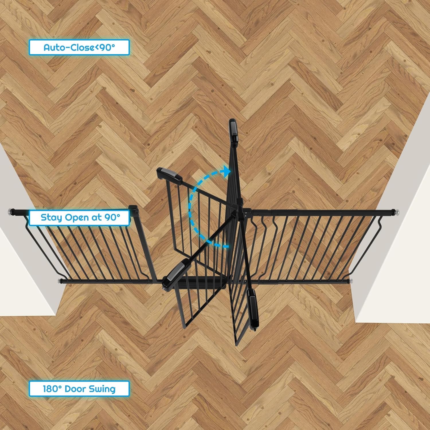 - Safe Double Lock & One Hand Operation: The safety gate latch with an ergonomic handle can be released with one hand, convenient when holding a baby in the other hand. Just press the latch down, pull back and lift slightly. Easy for adults, but difficult for toddlers, children or kids. Two-way swinging door. If opening angle is less than 90°, baby gate will be closed automatically; but if opening angle is more than 90°, baby gate will keep opening.