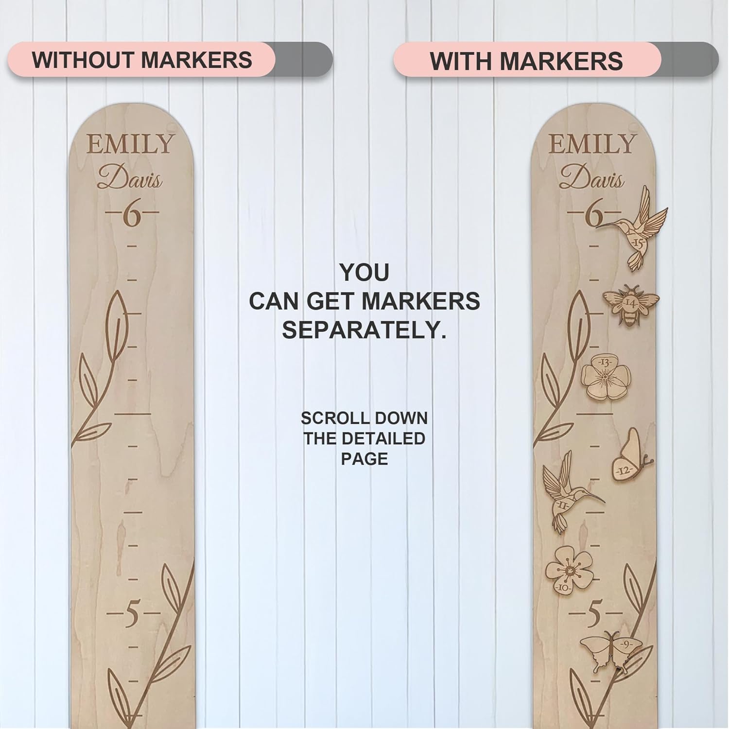 - Optional set of 16 wooden markers: presented in various forms, butterflies, hummingbirds, bumblebees, and flowers, can be attached to a baby kids measuring chart for wall wood with double-sided tape, to order an extra set of markers, scroll down the product detail page