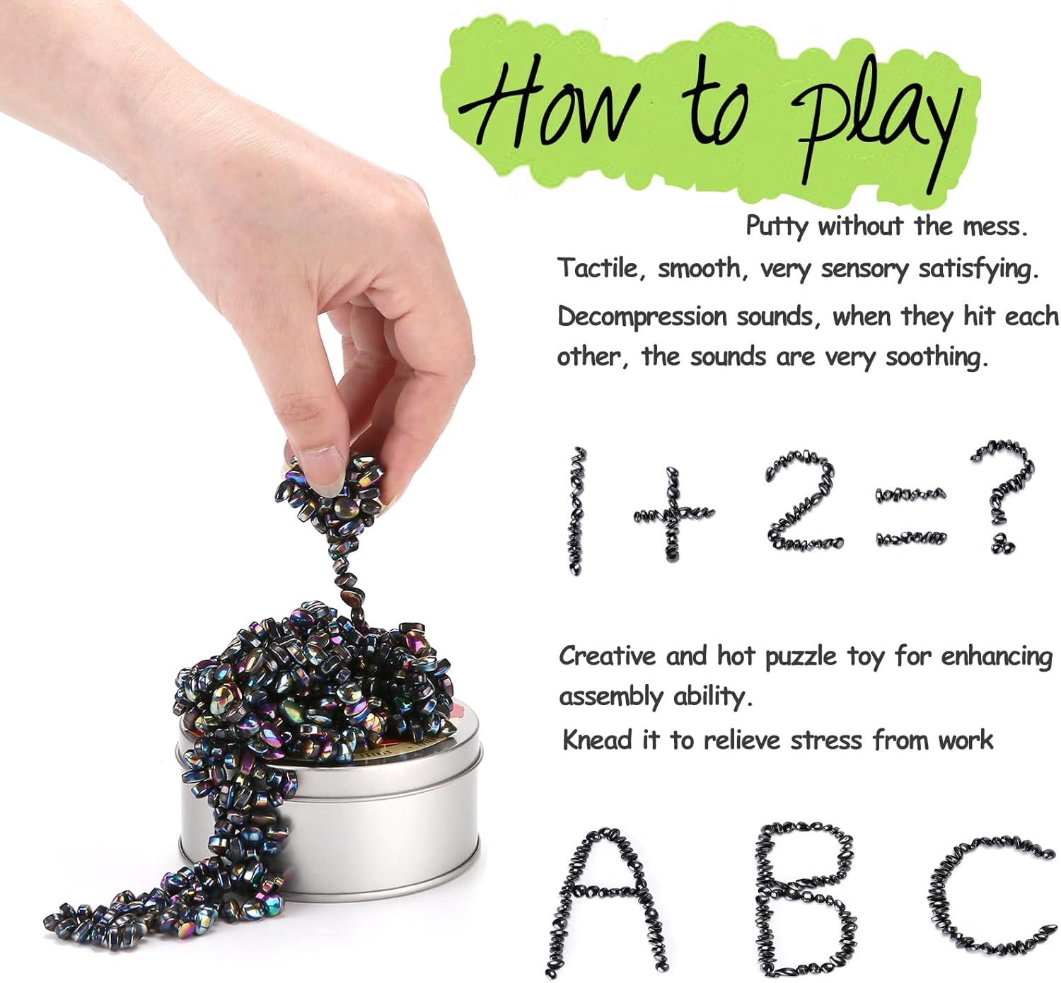 - Special design-weak attraction: magnetic balls sensory toys mainly considering the application scenarios of this product in the office, you can easily play with the crags with the other hand while looking at documents/reports/charts or even making a phone call. Use it for posing on your desk, or squeeze it to ease your anxiety without worrying about making a mess of your desk. All thanks to this product's weak appeal design.