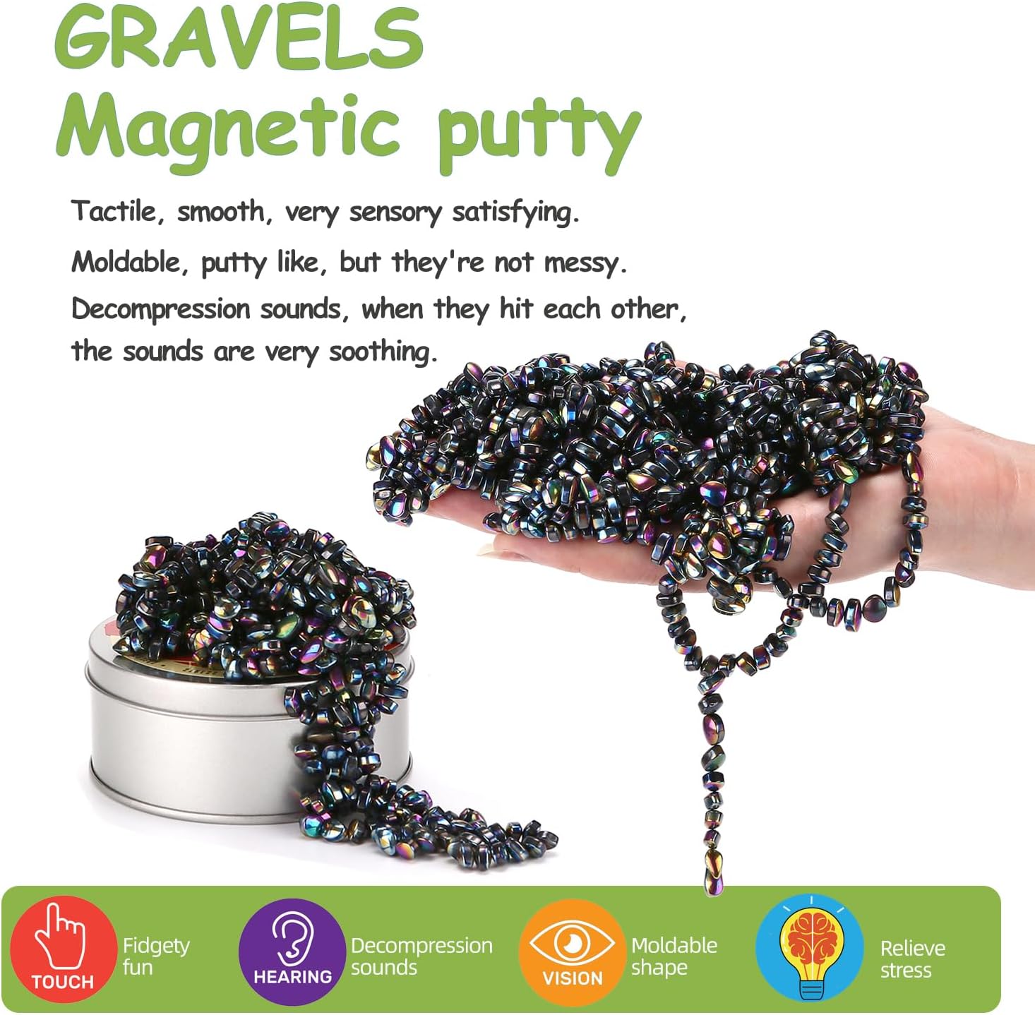 - Why Weak Attraction Is Needed: If the gravel attracts too much to each other, it will require two hands instead of one to play with the toy, which will focus on the toy for a long time instead of the work, causing distraction. That's not why we designed this toy. Imagine the stress of bosses/clients/projects making you restless at your desk. What if there was a product that would take your stress away without distracting you from work, and even inspires you, it's for you.