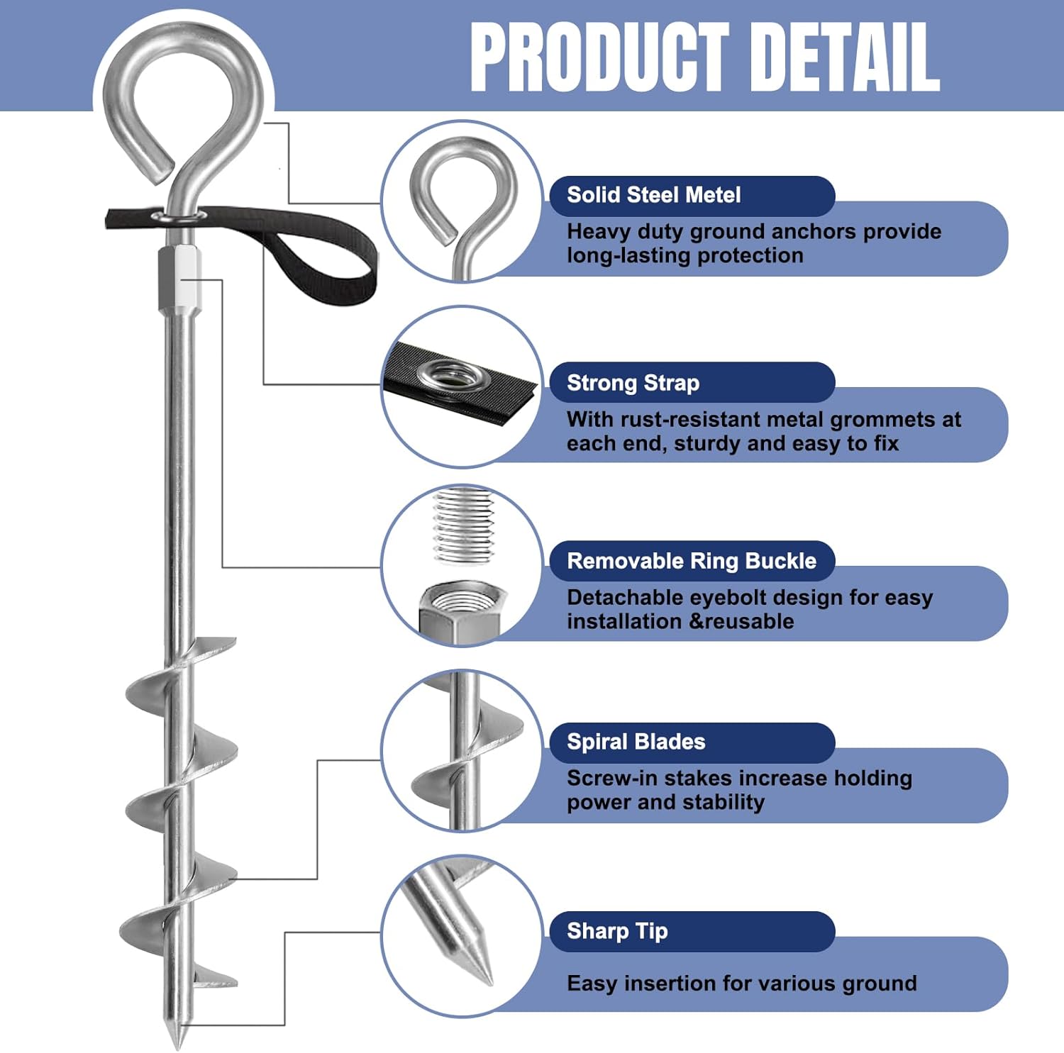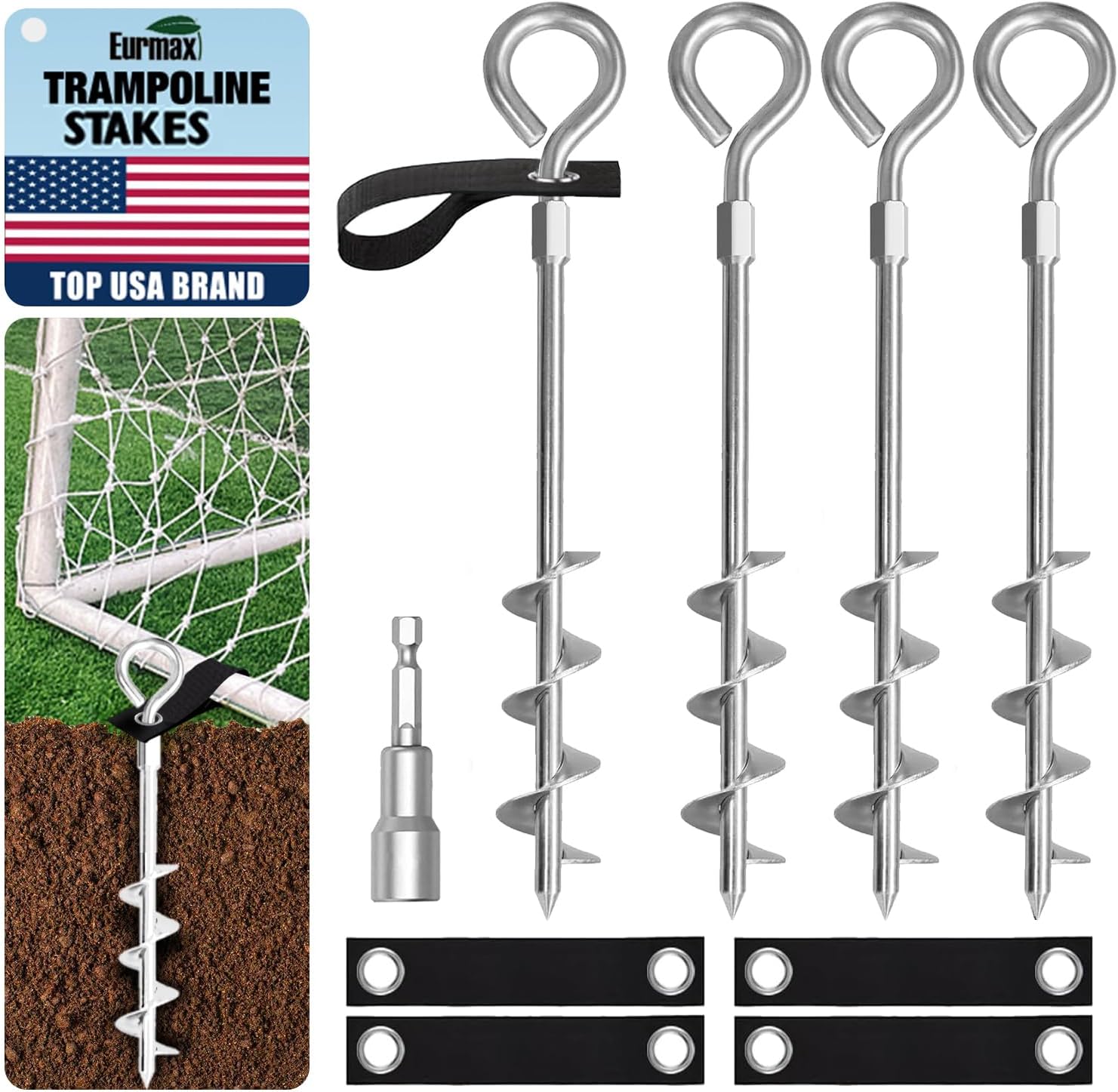 Eurmax USA Trampoline Stakes Screw in Tent Stakes Parts Heavy Duty for Canopies,4-Pack Outdoor Anchor Kit with Straps(Silver)