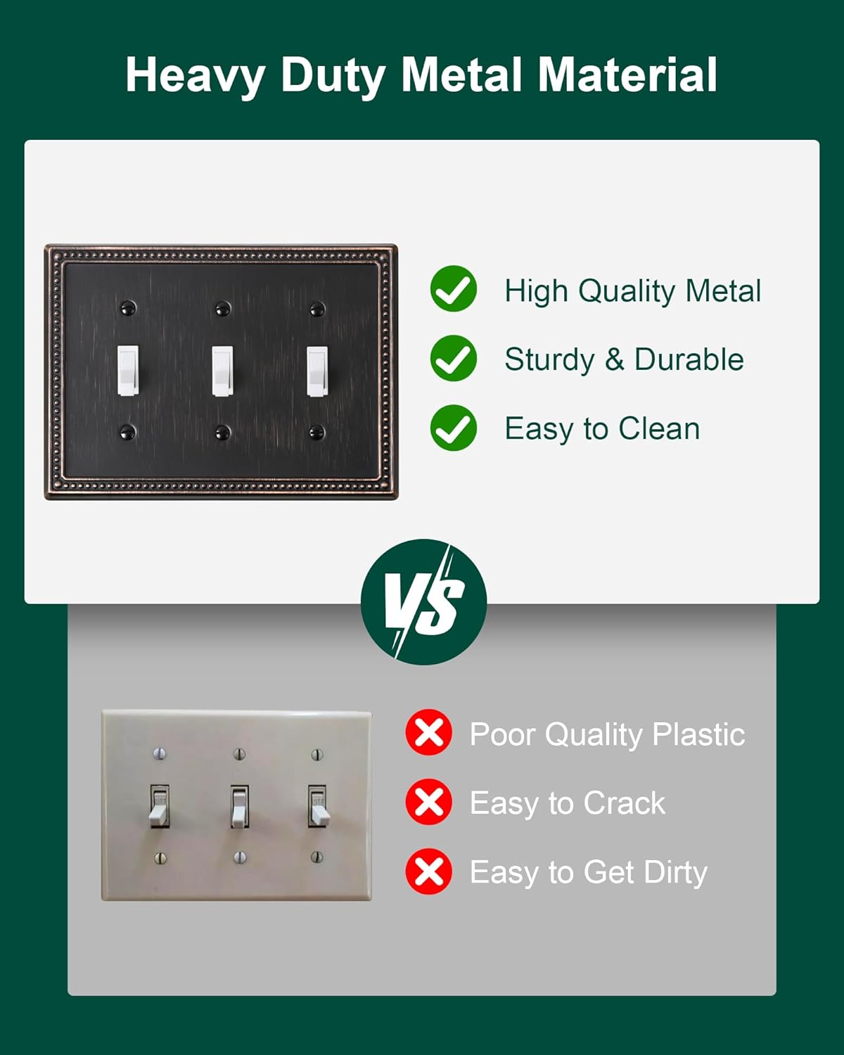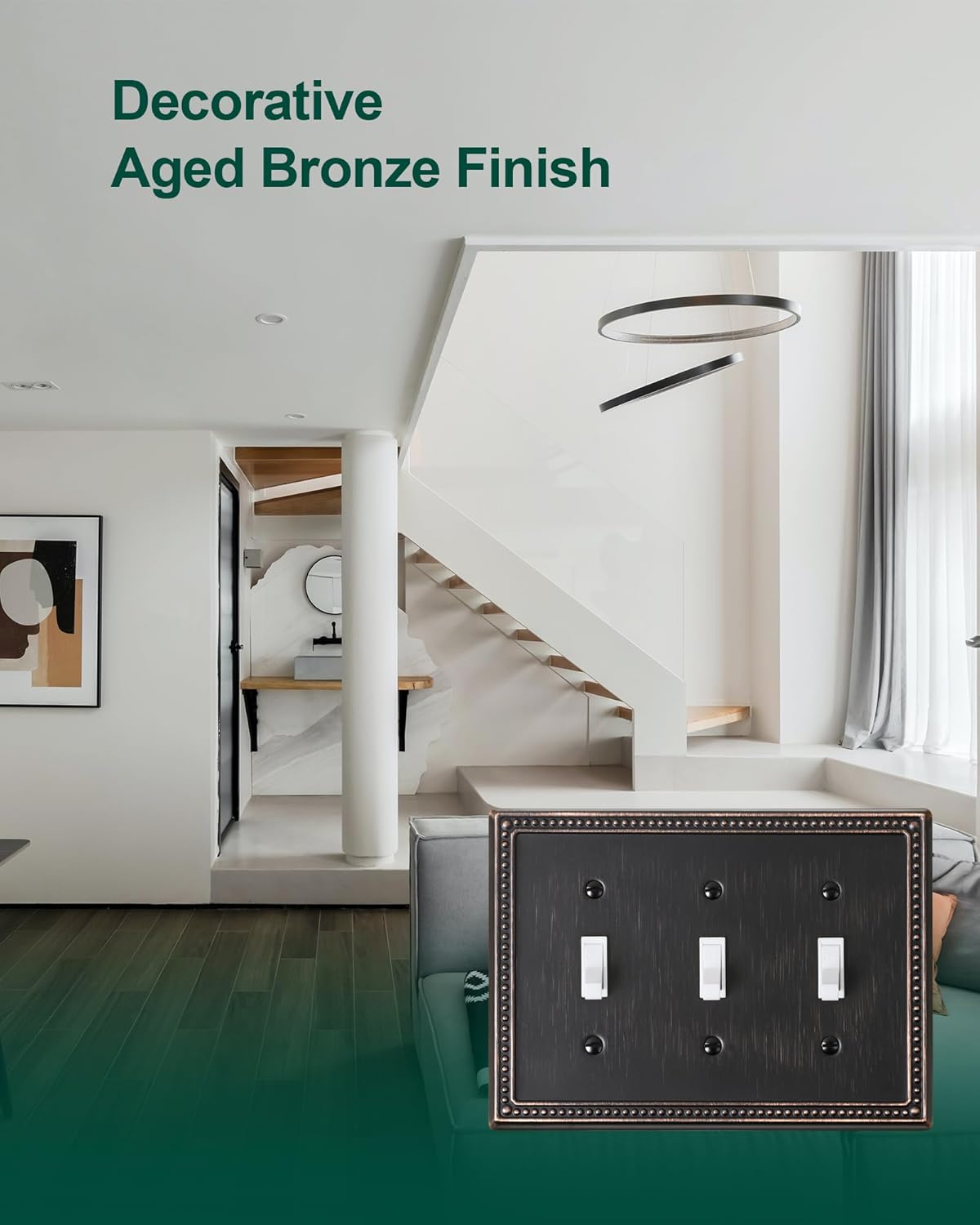 - Styling With Aged Bronze - The triple light switch plate cover features an exquisite aged bronzed finish with a traditionally styled beaded border. Offering a functional yet elegant enhancement to your home decor. Stylish yet retro bronze wallplate effortlessly blends practicality with a refined decorative accent and sophisticated charm.