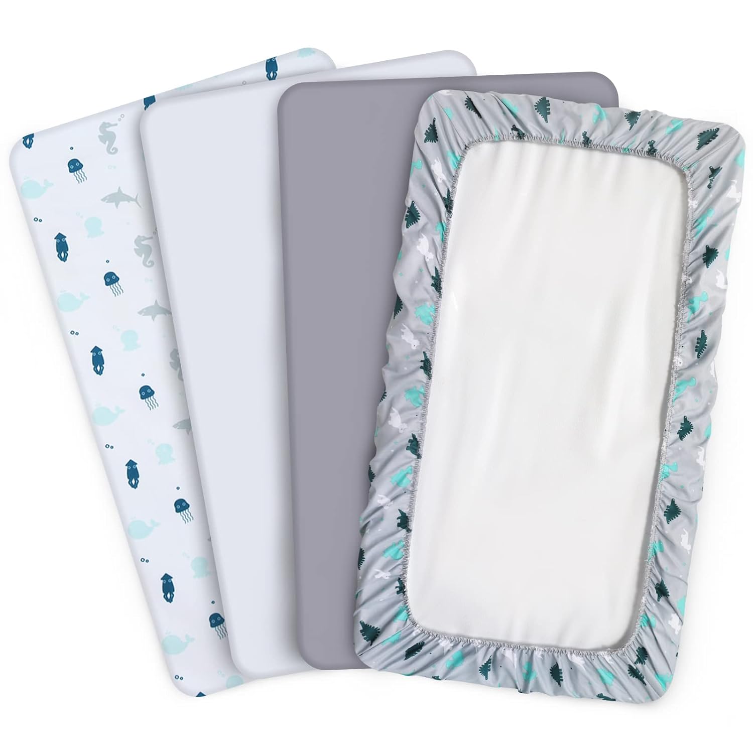- Super Soft & Quantity Options: These mini crib sheet sets 4 Pack have been carefully selected to be soft and breathable. No matter boy or girl, you can always find the best choice to match your playard bedding. We offer whales, dinosaurs, ocean, horses, pink, white, gray, aqua cute print. True to color. True to size.