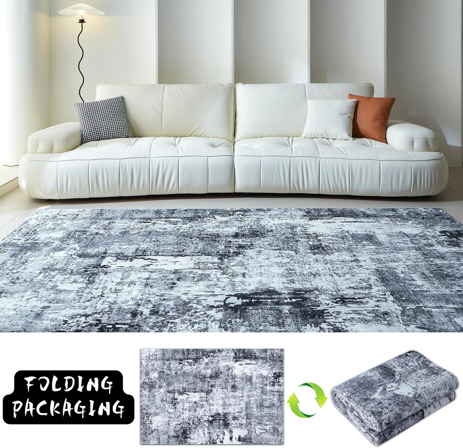 6x9 Rug Washable Bedroom Rug Large Soft Area Rug Abstract Pattern Non-Slip Faux Wool Vintage Rug for Living Room, Farmhouse, Dining Room, Kids Playroom, Grey and Black