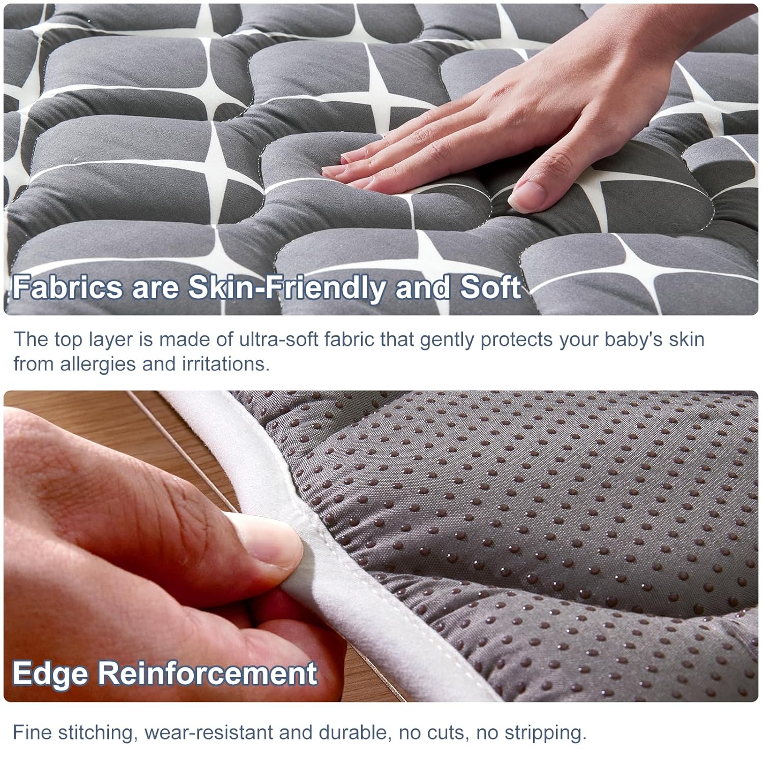 - ăNon-slip, thick and comfortă The back side of the 59x59 play mat for made of anti-slip material, and the bottom backing is silicone dots. It is thicker than other play mat. It prevents babies from causing pain when they fall or bump.