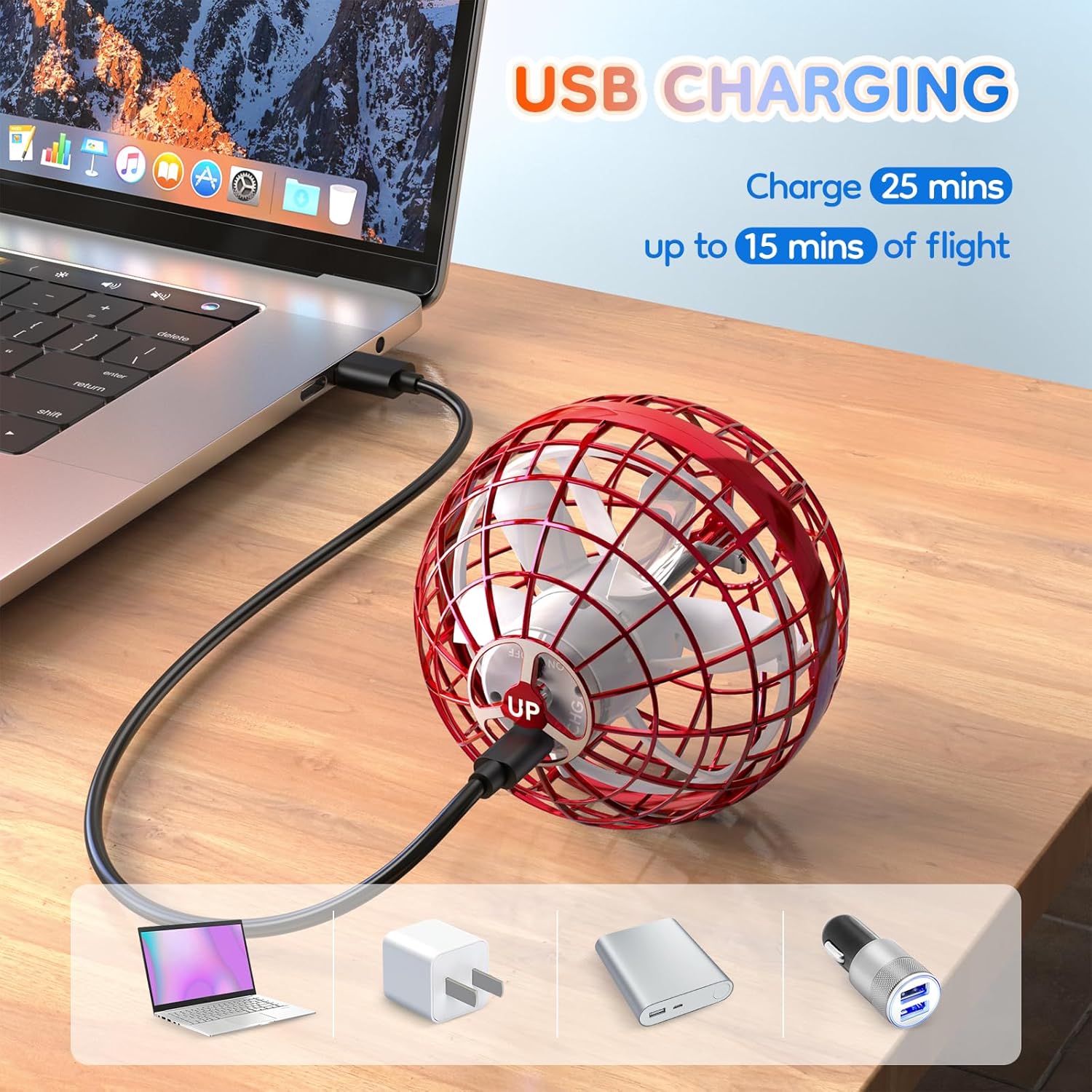 - 【Hand Controlled Drone Toy】 3 playing methods. Throw flying orb ball so comes back like a boomerang. Hand operated like a levitation mini drone. Straight fly ball to your partner. You may need practice before you can skilled use of it.