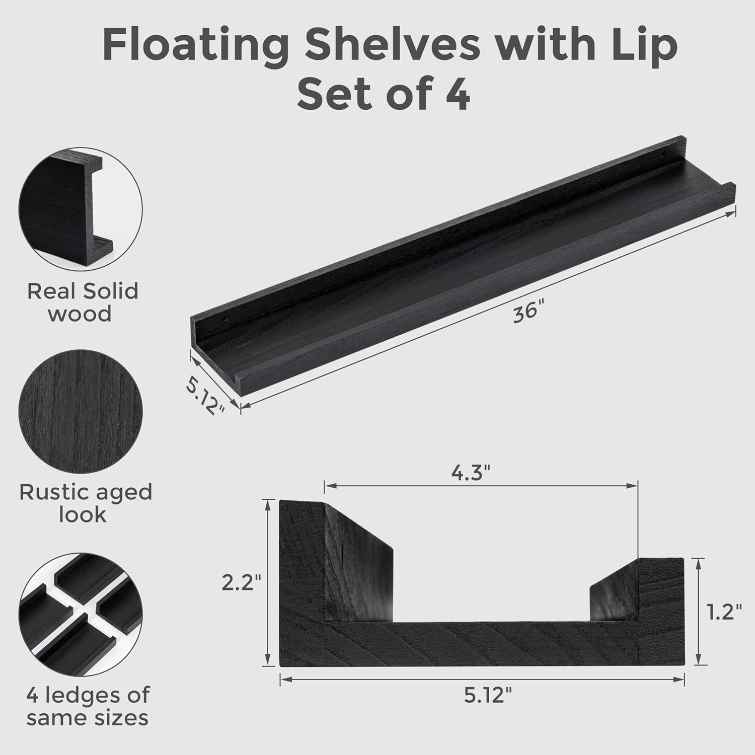 Fun Memories Floating Shelves Wall Mounted 36 Inch Long, Black Picture Shelves for Wall with Ledge, Solid Wood Wall Shelves with Lip Set of 4 for Bedroom, Kitchen, Bathroom