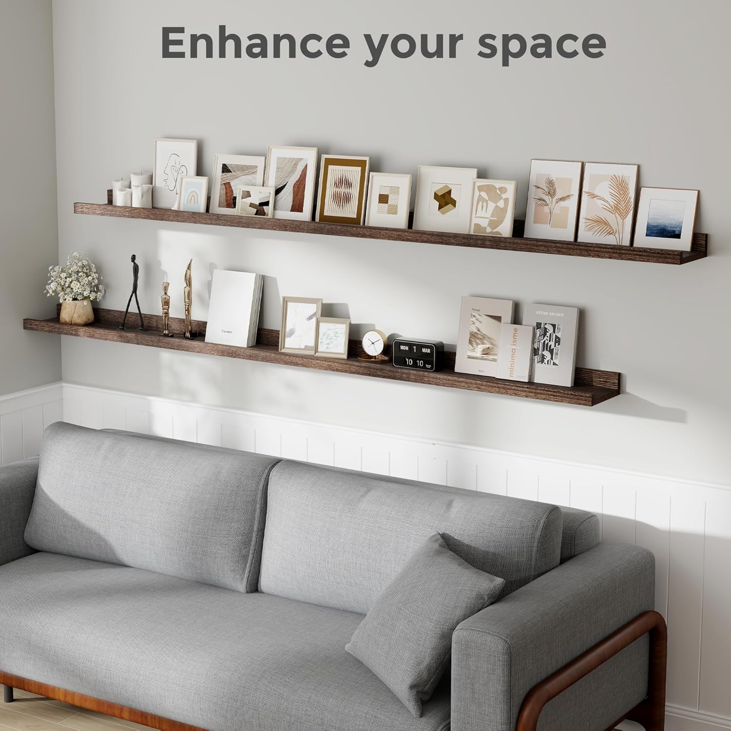 - 【Solid Wood Nursery Shelves】The wall shelves are crafted from Paulownia wood which are lightweight yet proportionately strong, sustainable real wood. The picture ledge wall shelf is SAME SIZE as each other (L 72" x D 5.12" x H 2.2") and is such an easy way to display photos without making lots of holes in your walls. They come fully assembled and all mounting hardware is included in the package.