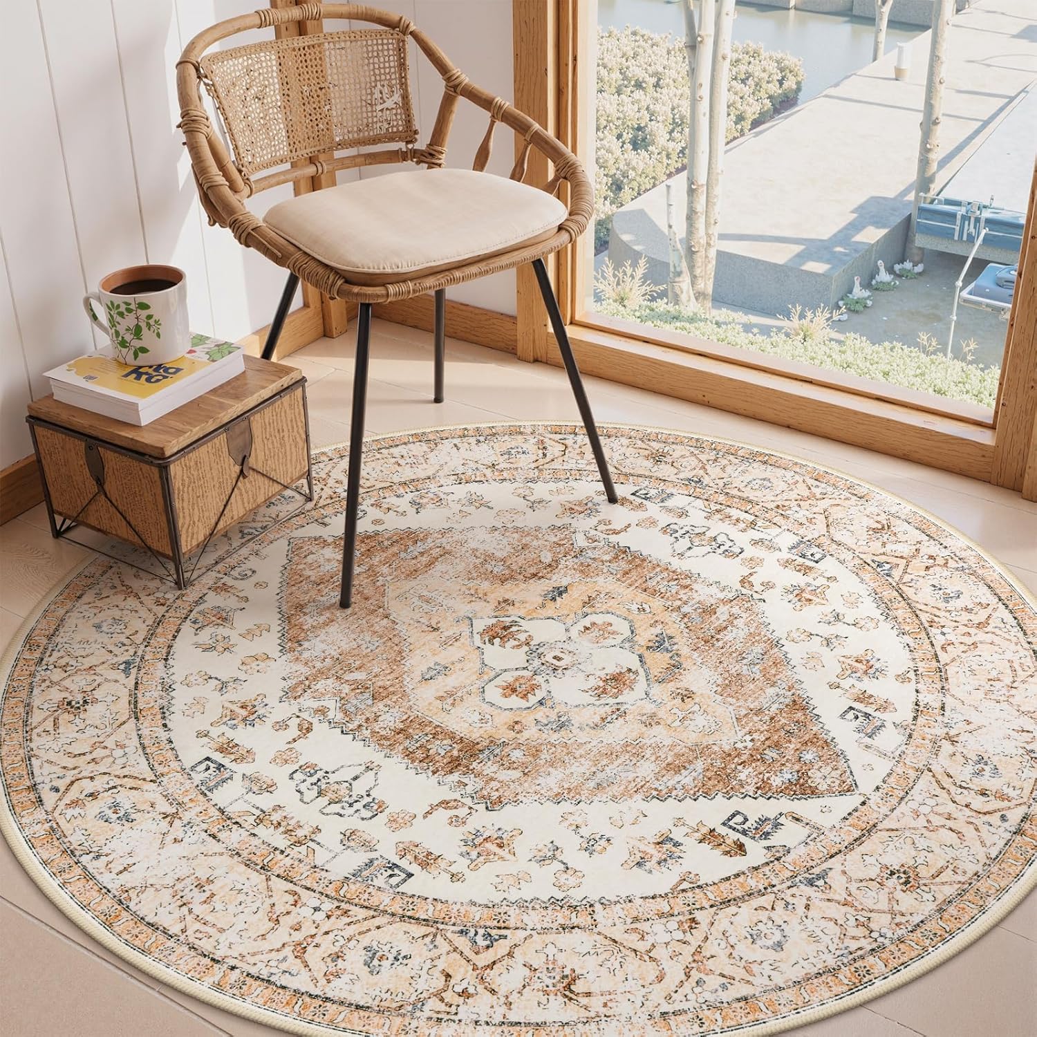 Lahome Boho Circle Rug - 6Ft Washable Round Area Rugs for Living Room Non-Slip Throw Dining Room Rug Large Round Carpet, Oriental Distressed Print Circular Mat for Office Classroom Bedroom Sofa