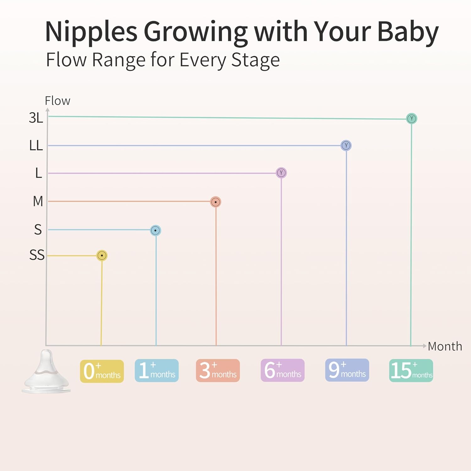 - SOFT AND FLEXIBLE SILICONE NIPPLE: For seamless switch between breast and bottle. It’s super soft and flexible to allow for natural and smooth tongue movement. Latch-on Line: The new design with latching curve of the nipple is guiding for baby’s appropriate latch, so as to achieve effective adsorption.