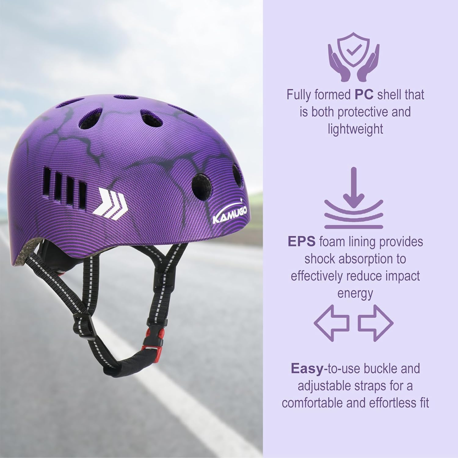 - PREMIUM SAFETY: KAMUGO kids helmets set are specially designed for kids head protection, complies with US CPSC Safety Standards,Child helmets are made with tough and durable Polycarbonate shell and high quality Expanded Polystyrene foam integrated molding,Toddler helmet have reflective markings on both sides and back, making exercise safer for children.