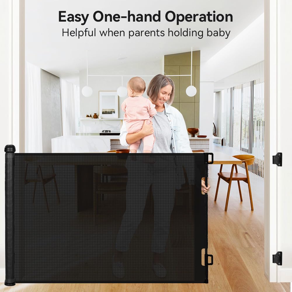 - 118" W x 34" H: The retractable baby gates is ideal to various indoor and outdoor spaces. Ideal as a baby or pet gate, the retractable dog gate easily retracts for space-saving convenience while maintaining a home's aesthetic