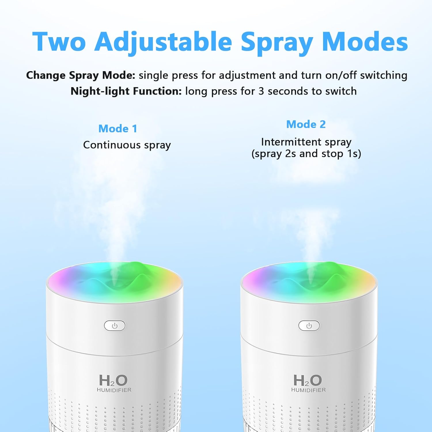 - 【Two Adjustable Spray Modes】This mini humidifier has two spray modes: Continous spray(4 H) Intermittent spray(8 H). When you press the button first time, it will continuously spray for 4 hours to quickly boost indoor humidity, effectively combat dryness. When you press again and it will intermittently spray (spray 2s and stop 1s)for 8 hours, ideal for nighttime use. No water will automatically cut off the power.