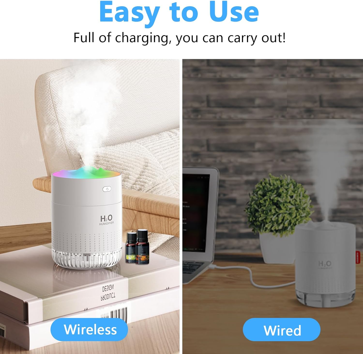 - 【7-Color Cycle LED Light】This small humidifier has a color breathing light function. When you turn on the humidifier, the colored breathing lights will light up, and the light colors will change in sequence, creating a romantic and exquisite atmosphere. Ideal for people who are sensitive to light at night, long press the switch for 3 seconds to turn off the light. When you don’t want to use the humidification function, you can press and hold the switch for 3 seconds to turn on the breathing light function separately and use it as a night light.