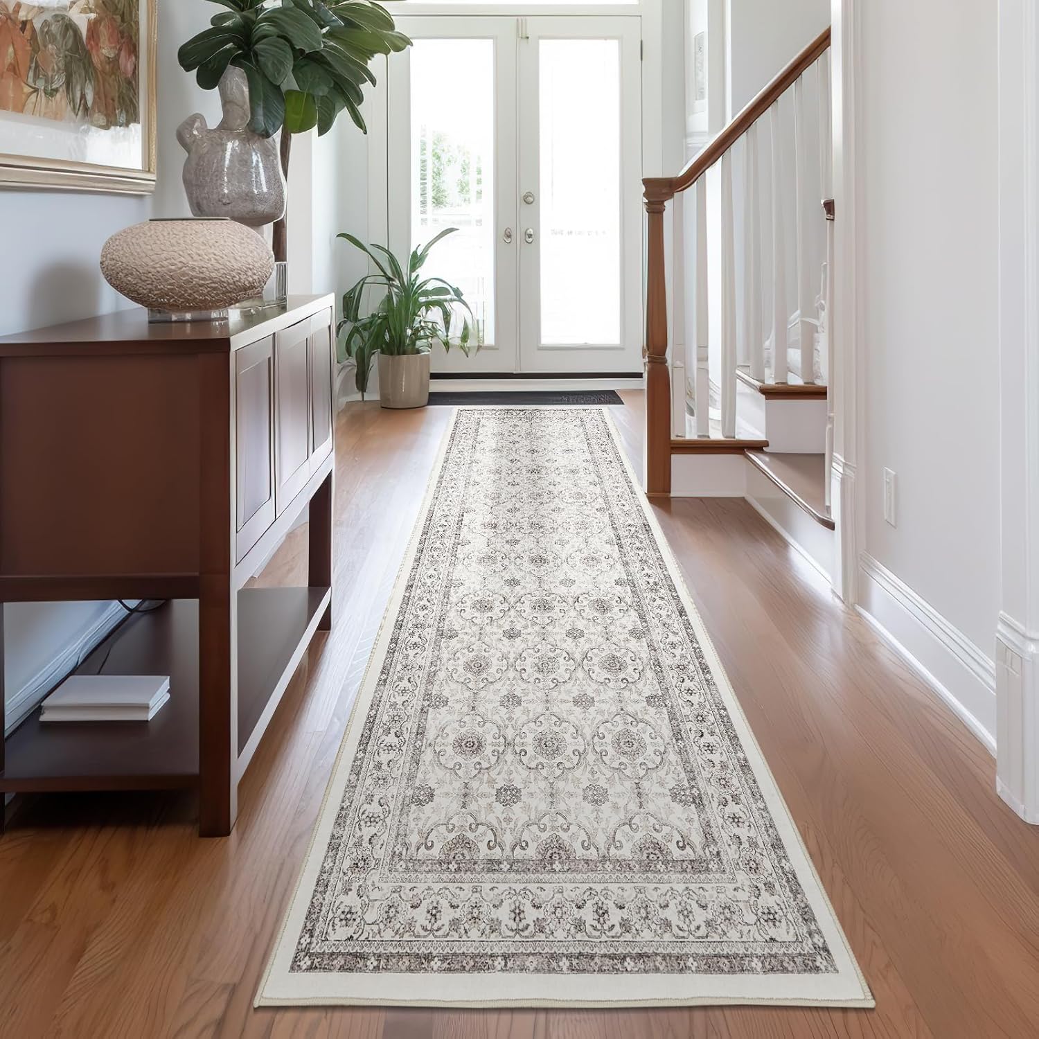 jinchan Hallway Runner Rug 3x7 - Machine Washable Beige Vintage Floral Distressed Design Soft Non-Slip Low-Pile Ultra-Thin Runner Rug for Kitchen Laundry Room Bedroom Farmhouse (3‘x7',Beige)