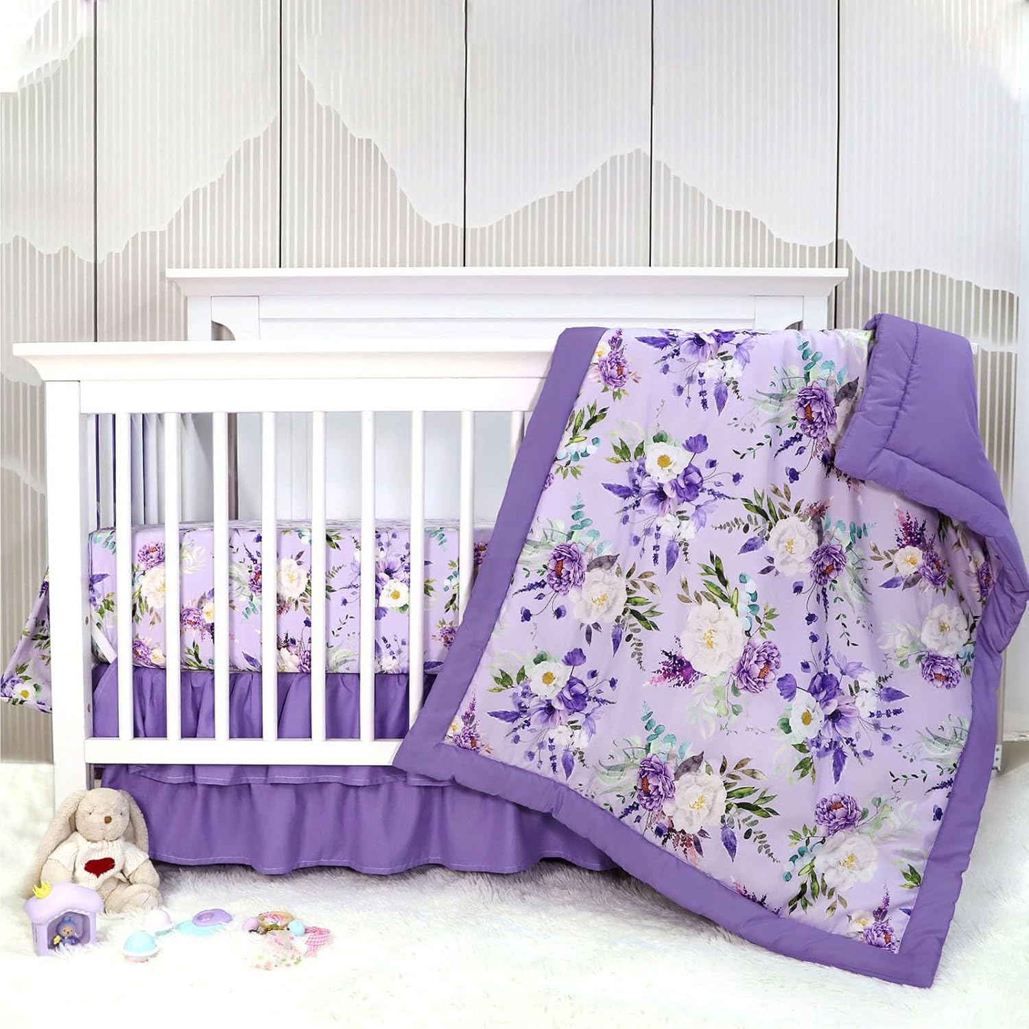 Crib Bedding Set for Girls, Purple Baby Crib Bedding Set 4 Piece, Baby Girl Nursery Bedding Set Including Comforter, Fitted Crib Sheet, Crib Skirt, Diaper Stacker, Floral