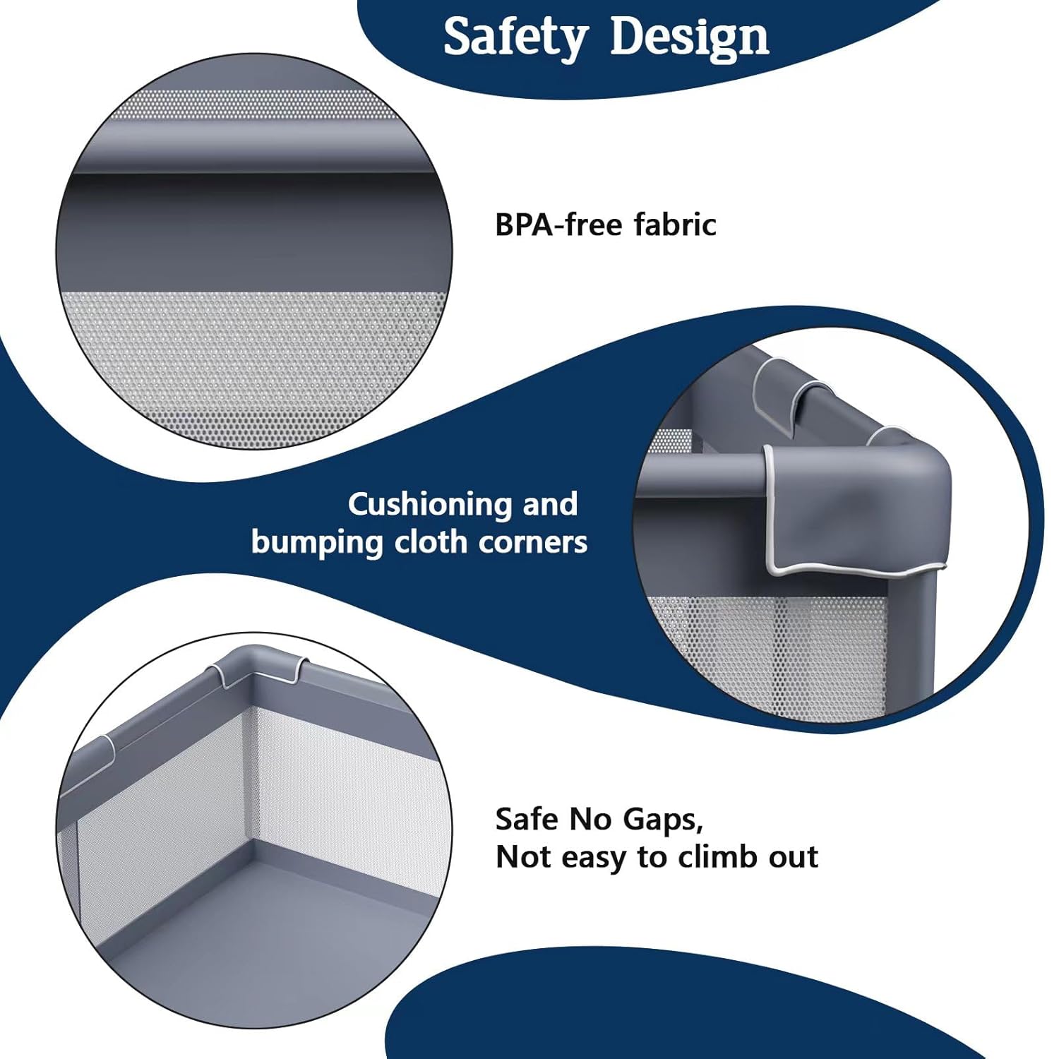 - 【360 ° VISUAL DESIGN】The Baby playpen is 360 ° Full View, even if you are busy doing other things, its sides allow you to keep an eye on baby at all times. At the same time, baby can also see mom through the mesh, making them feel full safety.