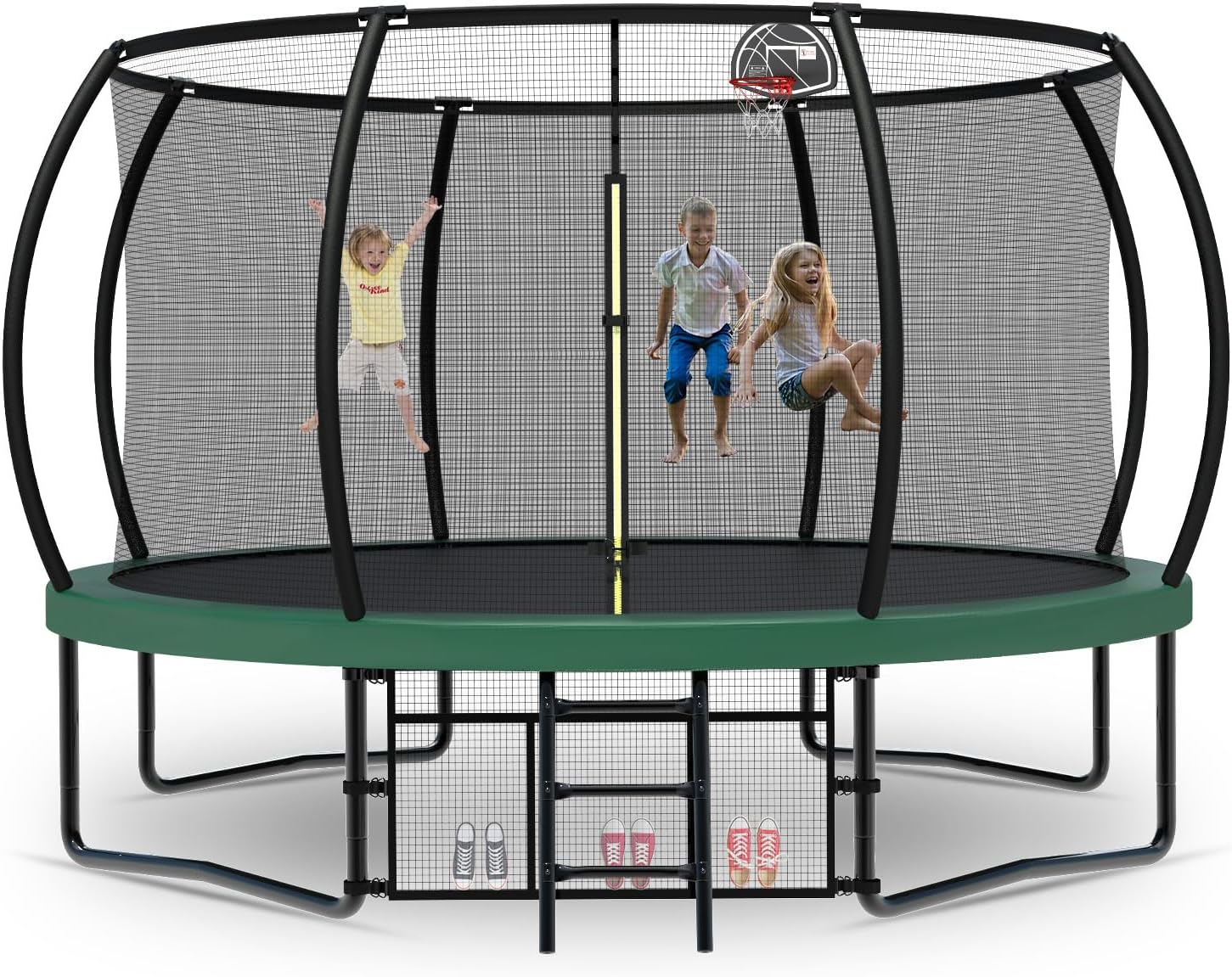 Tatub Large Trampolines Outdoor 10 12 14 15 16FT for Kids and Adults,Outdoor Recreational Pumpkin Trampolines with Curved Poles and Safety Enclosure Net, Basketball Hoop, Ladder