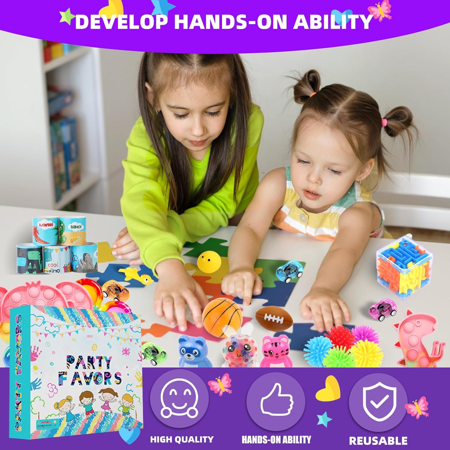 - 【Party Favor for Kids】High quality novelty toy set for kids. Every fidgets party gift toy is made from high quality materials. It has passed rigorous safety tests. Very safe for children and adults. Suitable for goodie bag stuffers,treasure chest,birthday party favors,classrom prize,treasure box,carnivals,prize boxes toys,piñata filler,kids christmas presents,bulk fidget toys,kids party supplies,stocking stuffers,school classroom rewards.