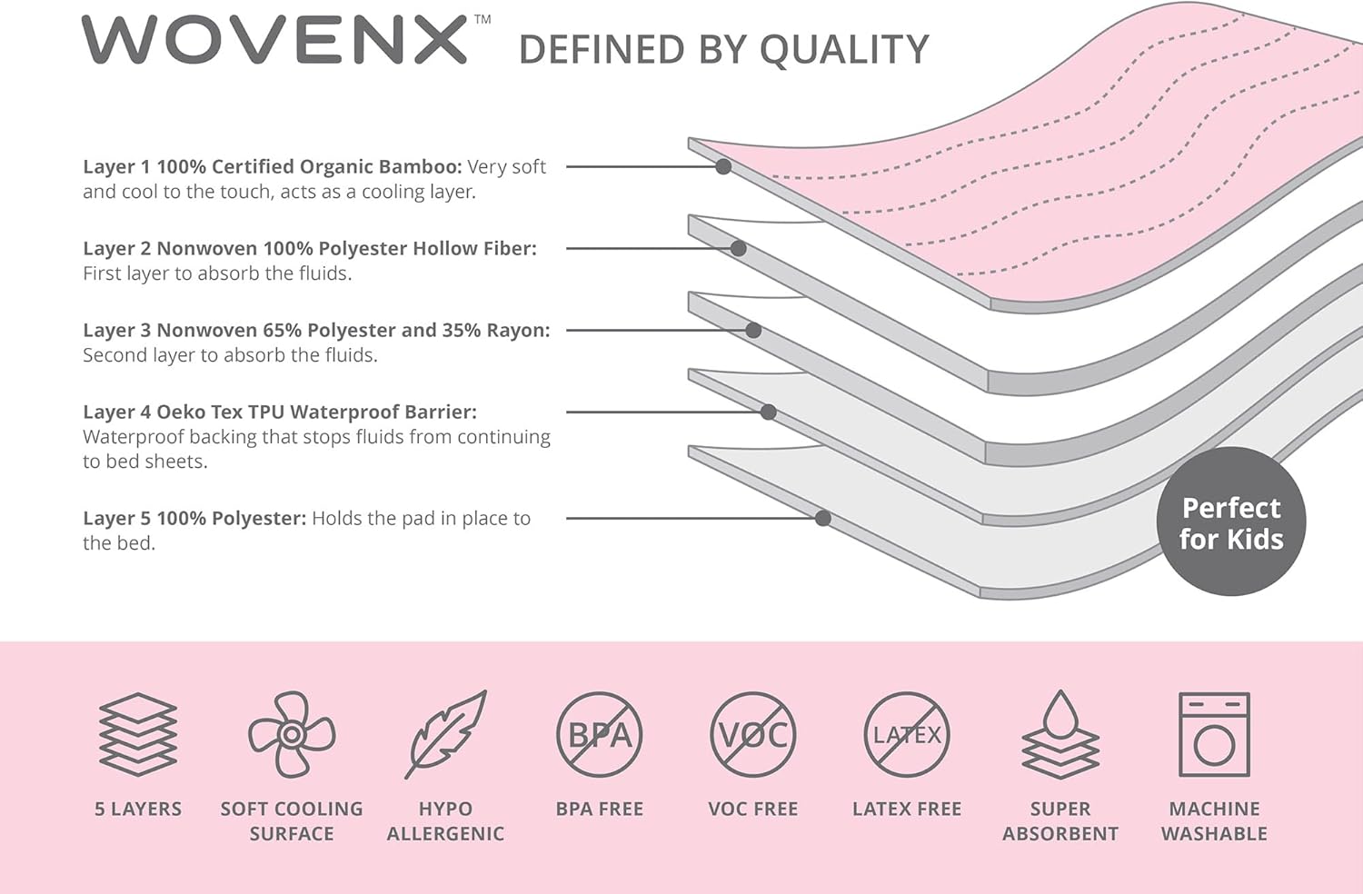 - MULTI-LAYER PROTECTION: Designed to effectively absorb urine, keeping bedding dry throughout the night. WOVENX's children’s pee pads feature five layers, including: a viscose derived from bamboo comfort layer, two super absorbent nonwoven layers (polyester and rayon), TPU waterproof barrier to prevent fluids from leaking through, and polyester non-slip backing to stay in place.