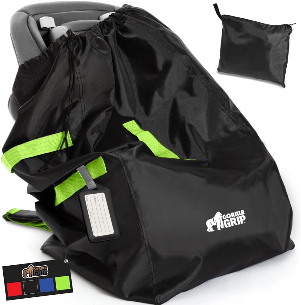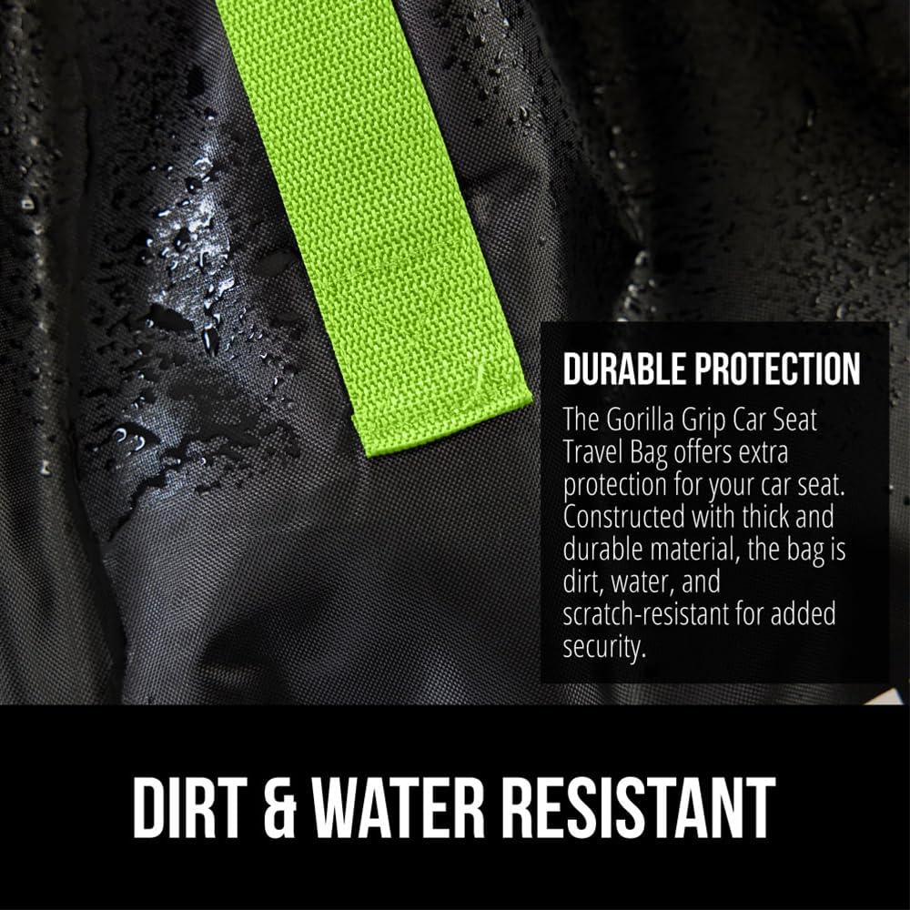 - DURABLE PROTECTION FOR YOUR CAR SEAT: a must for traveling, the Gorilla Grip Car Seat Travel Bag is designed to help protect your car seat while you travel; bag is water, tear and dirt resistant; features drawstring closure that tightly closes around the car seat, helping to protect from dirt, grime and moisture; bag is made of lightweight, yet durable material that can be machine washed