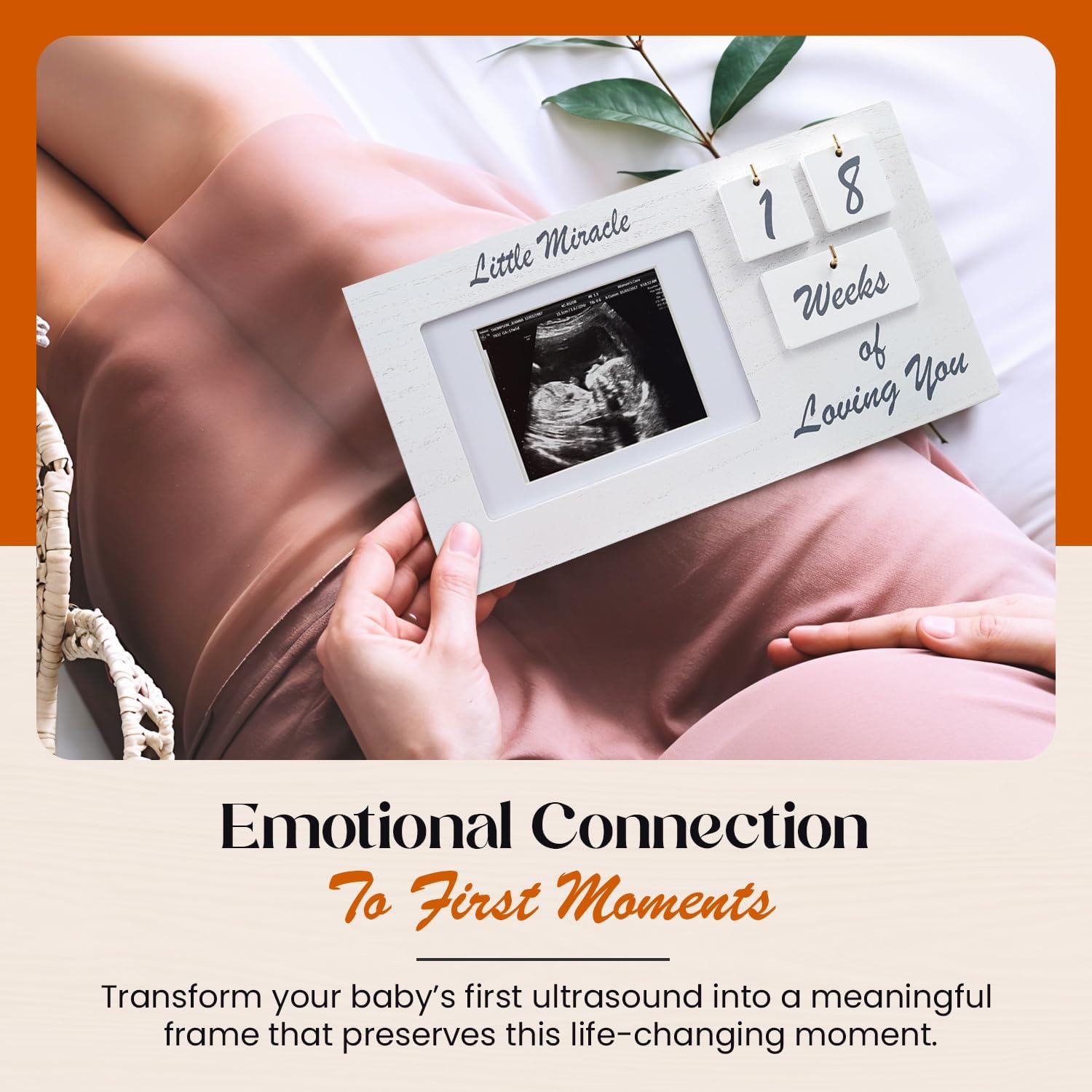 White Ultrasound Sonogram Picture Frame with Milestone Tracker – Elegant Wooden Keepsake for Expecting Parents – Nursery Décor Gift for New Moms – Countdown Tiles Included – 12" x 6" Design