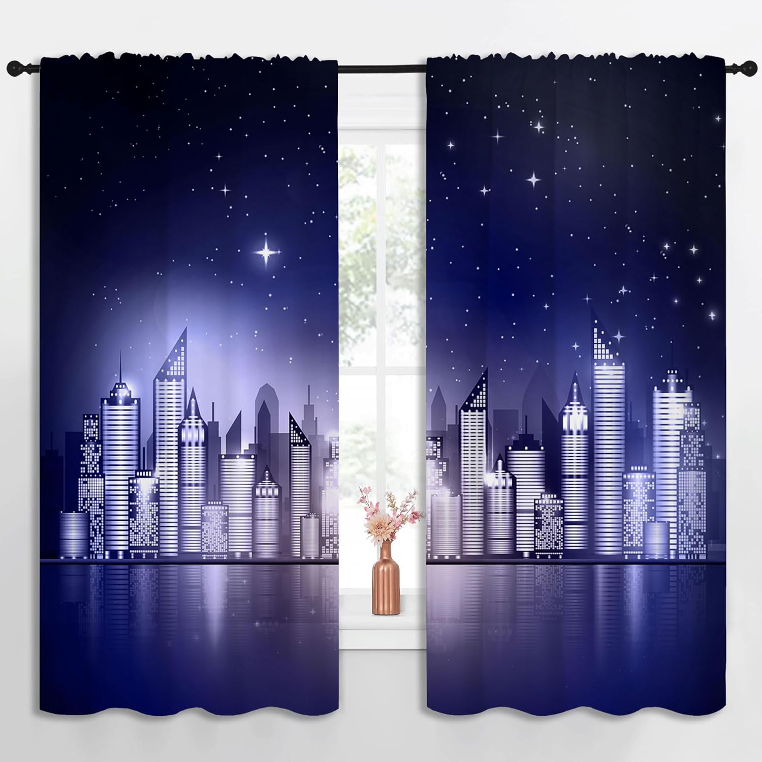 City Rod Pocket Blackout Curtains for Boy Girl Bedroom, New York Skyline Modern City Starry Sky Night View Thermal Insulated Home Window Drapes for Living Room Darkening, 55x63 inch