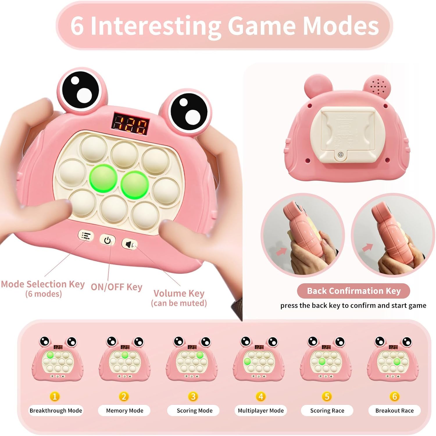 - UPGRADED QUICK PUSH GAME CONSOLE: Our pop fast push game have 6 game modes: breakthrough, memory, scoring, multiplayer mode, scoring race, breakout race. Just press the back button to start, and need 3 AAA batteries. Note: Not included batteries