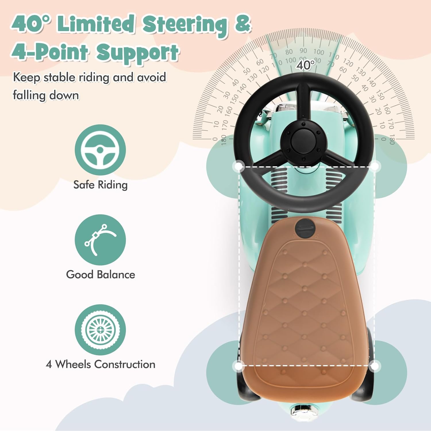 - 【Retro Appearance & Safe Design】With charming retro style and 2 funny stickers, this kids ride on car is sure to catch your child's eye. The air horn with beeping sound offers endless fun. Plus, the safe rounded corner and non-slip seat add additional safety, making the toddler riding toy a safe choice for your infants.