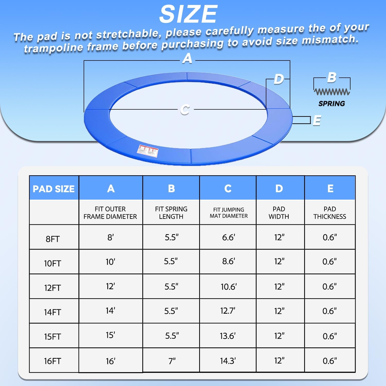 • Universal Size: KENSONE trampoline replacement pad is made for universal use, fitted with most 8/10/12/14/15/16FT trampoline frame in the market. The pad is not stretchable, please carefully measure the size of your trampoline frame before purchasing to avoid size mismatch. We have presented detailed product size data in the product pictures for your reference